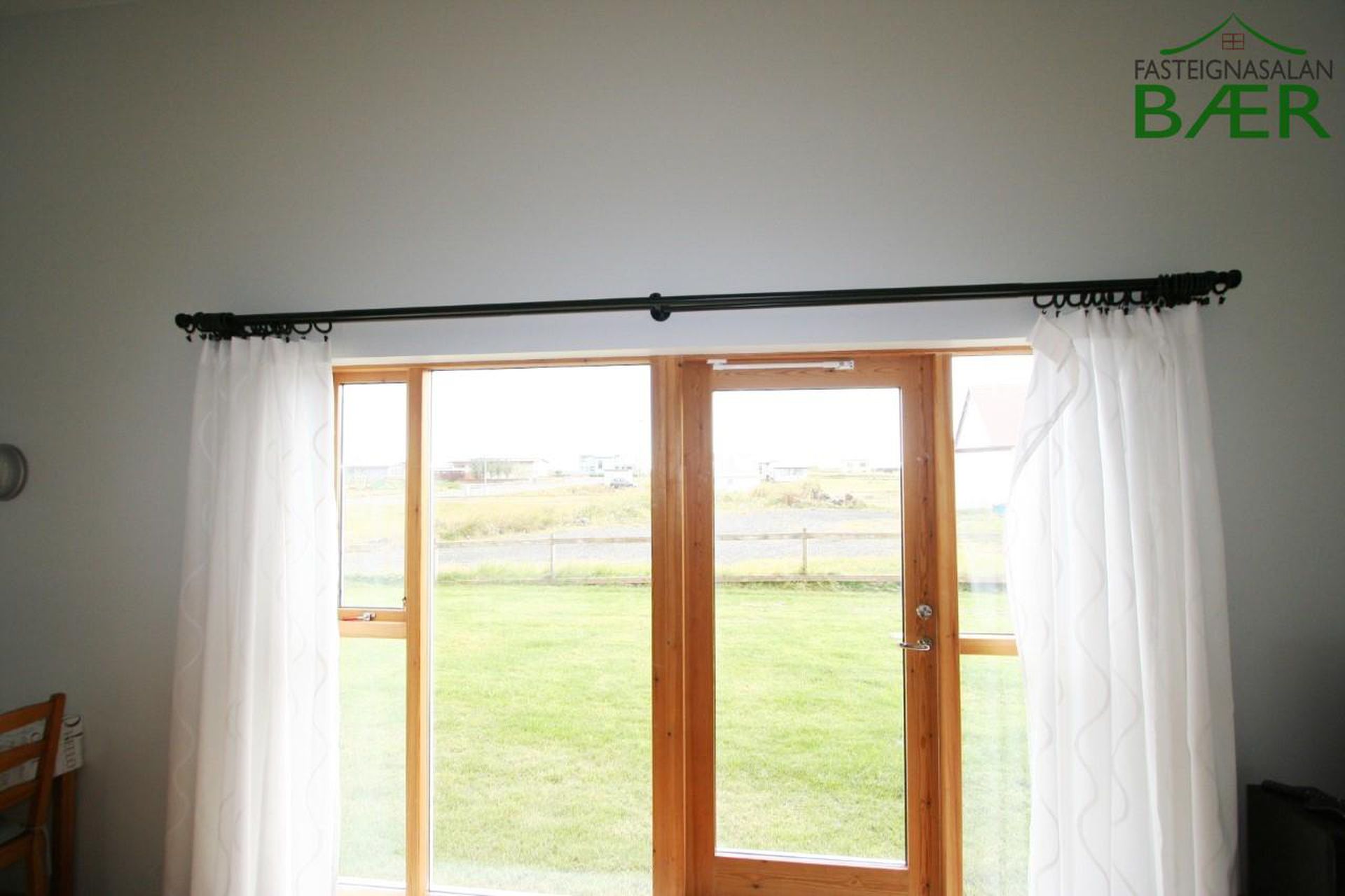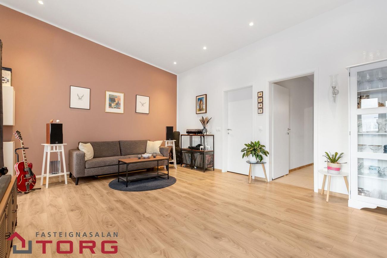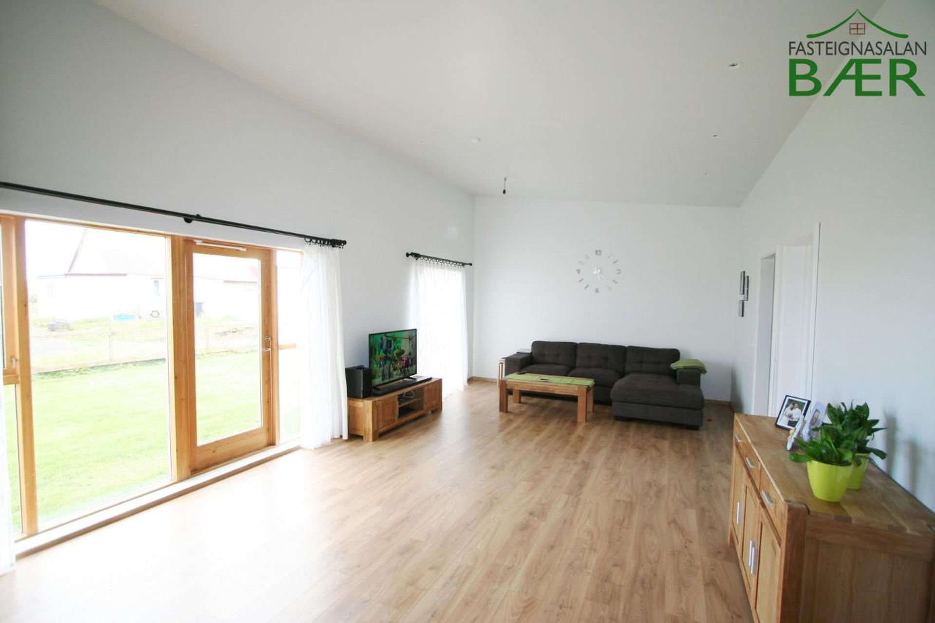 Alrými er bjart og opið með gólfsíðum gluggum í stofu, þaðan sem unnt er að ganga út í bakgarð eignarinnar sem snýr í suður.