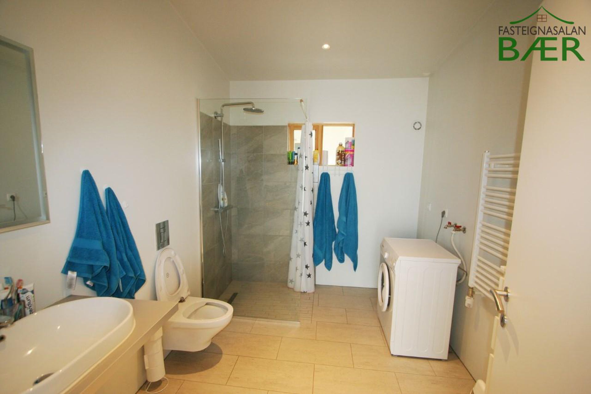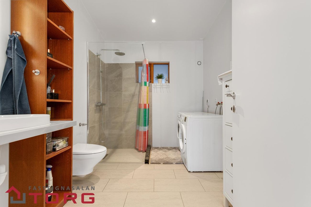 Baðherbergi: flísar á gólfi, upphengt salerni og sturta. Pláss fyrir þvottavél og þurrkara.