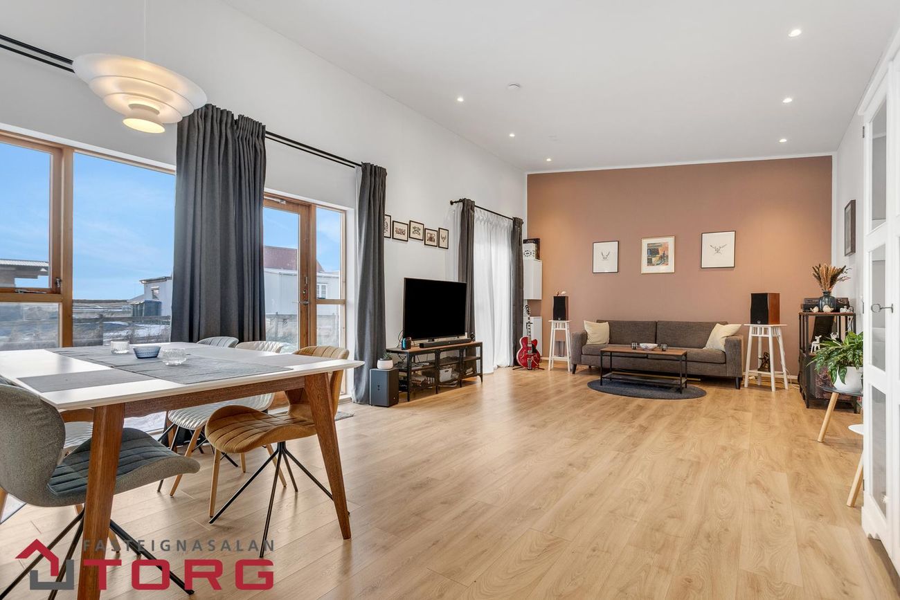 Stofa- og borðstofa: parket á gólfi, bjart og opið rými með gólfsíðum gluggum, útgengt í garð sem snýr í suður.