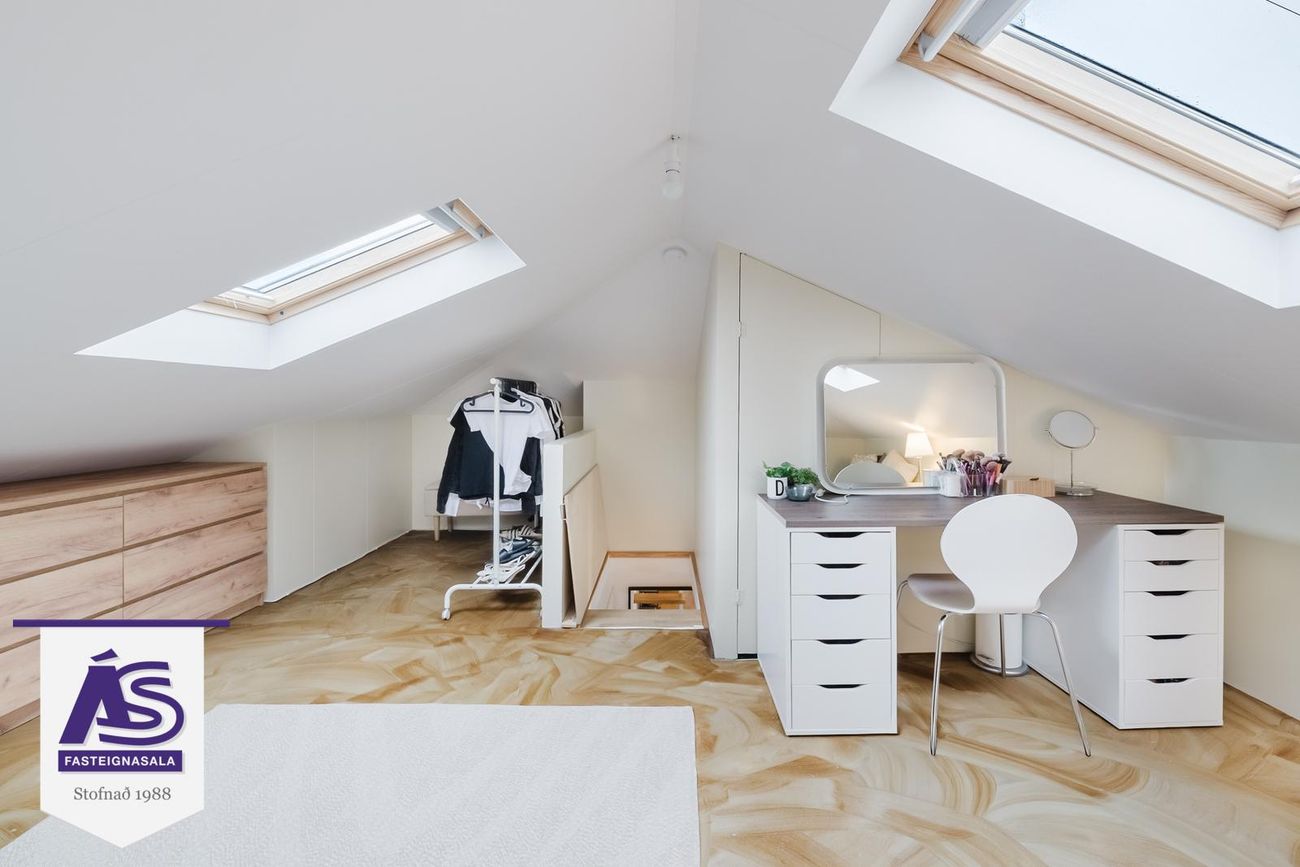 Aðalhæð 106,2 fm með opnu rými, anddyri 8,4 fm, sér geymsla í kjallara 3,9 fm og bílskúr 36 fm. Háloft yfir íbúðinni með glugga (um 10 fm gólfflötur).