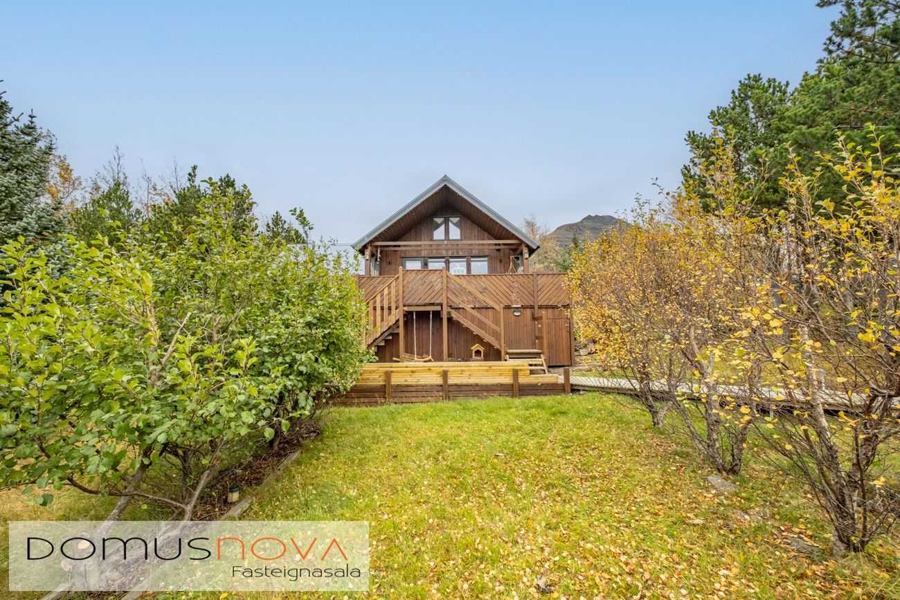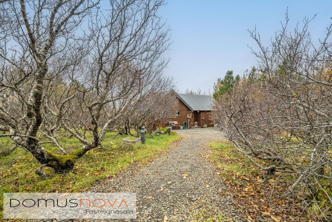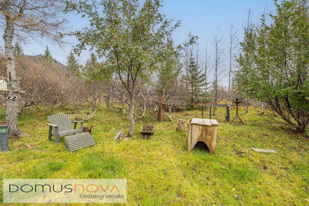 Lóðin er kjarri vaxin þar er mjög skjólsælt og hlýtt þegar sólar nýtur. Gott bílastæði.Lýsing á eign
