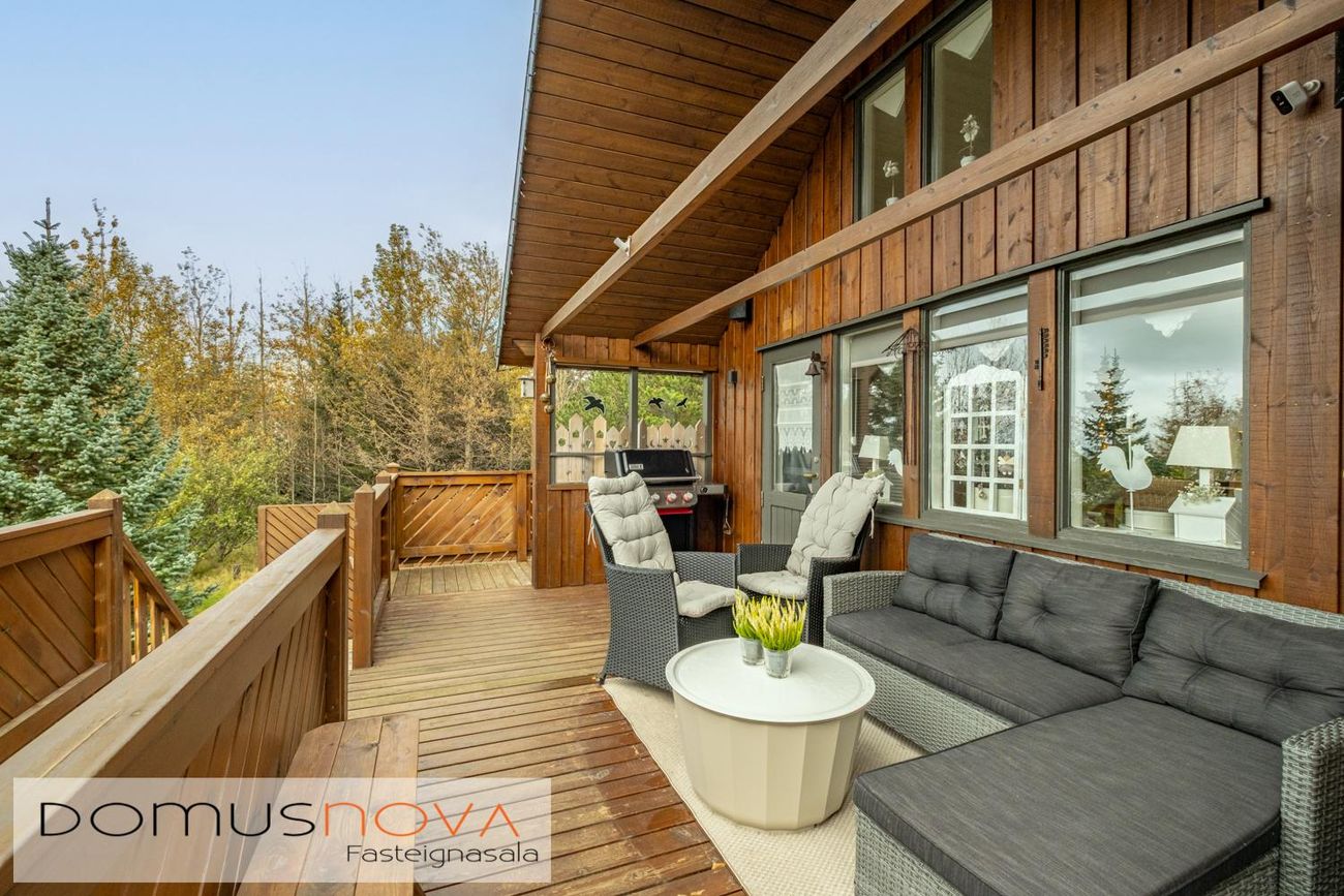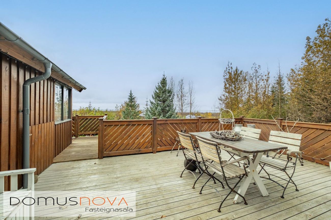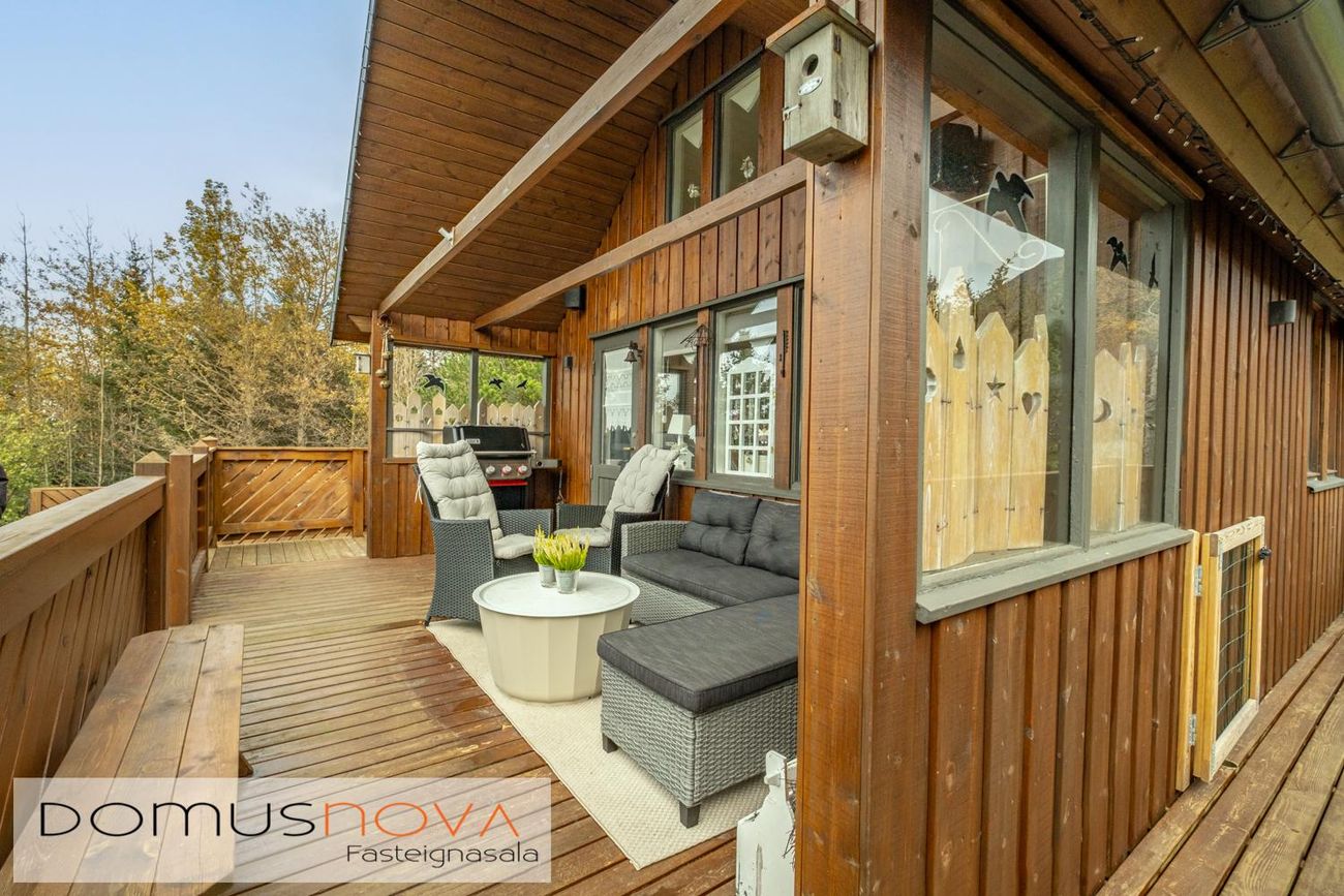 Lóðin er kjarri vaxin þar er mjög skjólsælt og hlýtt þegar sólar nýtur. Gott bílastæði.Lýsing á eign