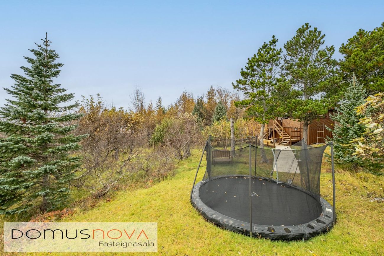"Leikhús" með góðum sólpalli og stórt niðurgrafið trampólín. Ævintýra lóð með fallegu útsýni útá hafið.