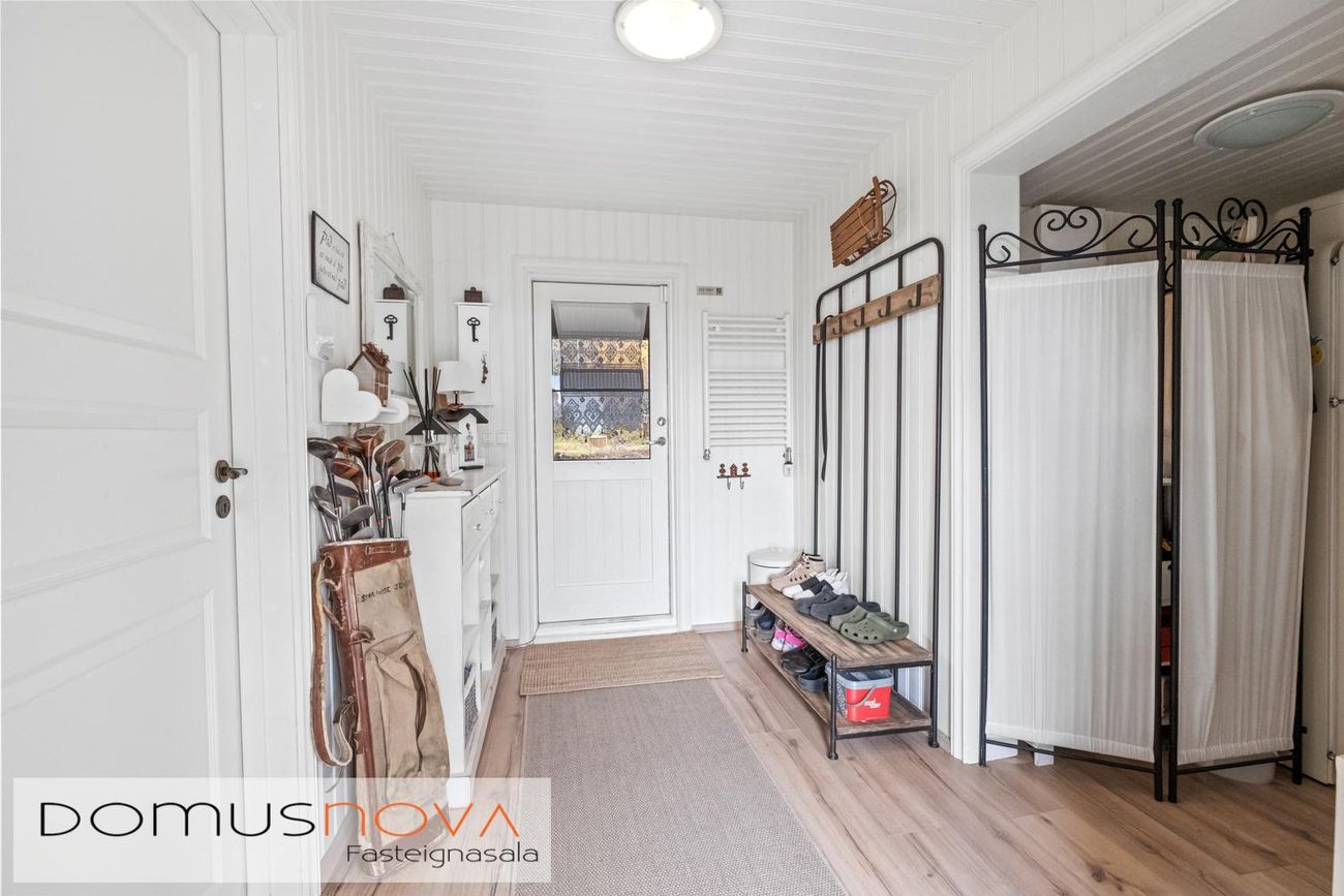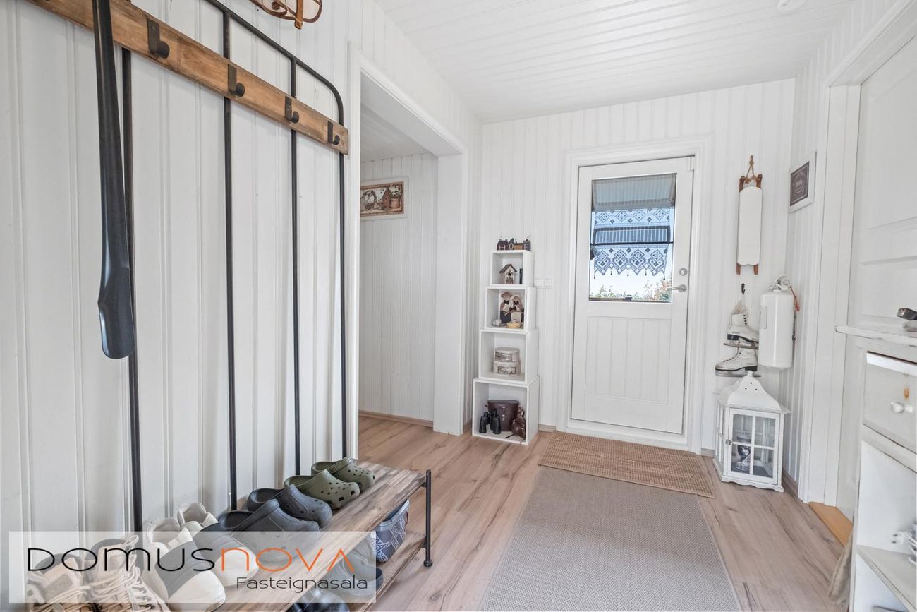 Forstofa með parketi á gólfi og hengi, dyr útá sólpall.