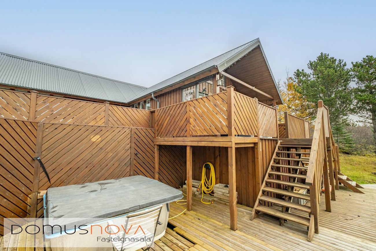 Stór sólpallur með heitumpotti.