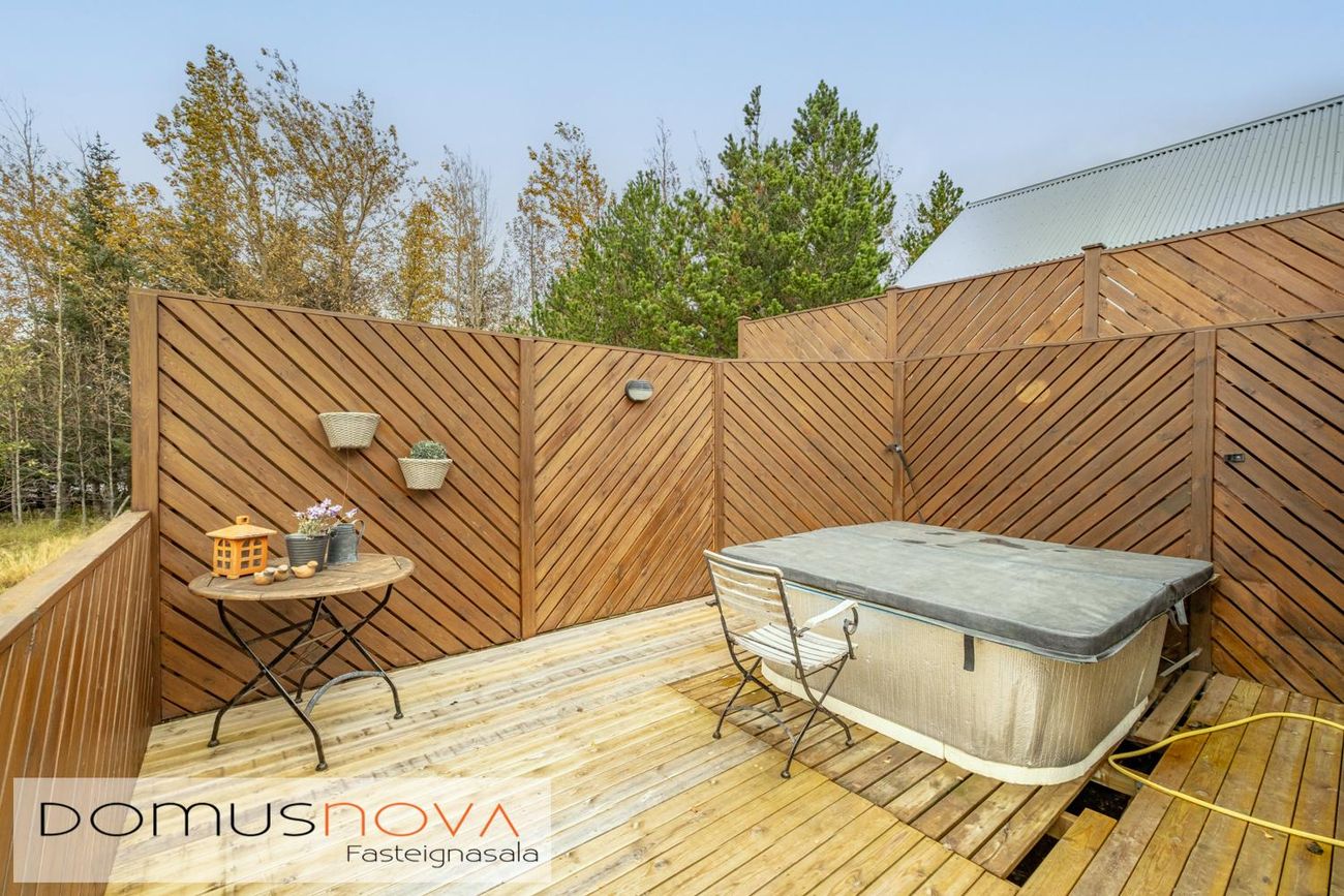 Stór sólpallur með heitumpotti.