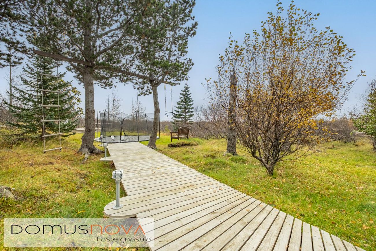 "Leikhús" með góðum sólpalli og stórt niðurgrafið trampólín. Ævintýra lóð með fallegu útsýni útá hafið.