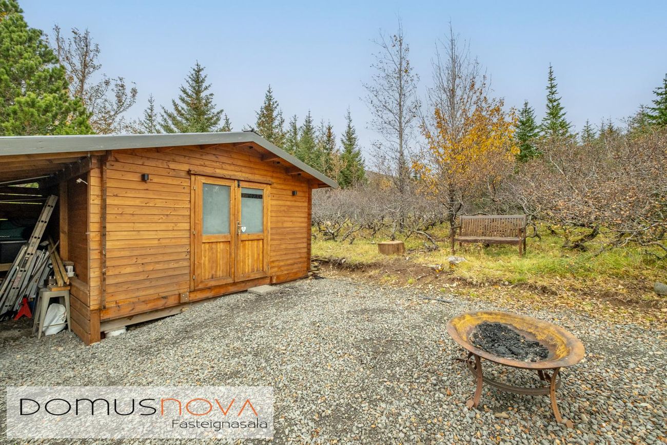 Geymsluskúr er kyntur, kalt vatn og rafmagn. (ekki inní uppgefnu flatarmáli). Tengi fyrir þvottavél. og þurrkara með góðu bíslagi.