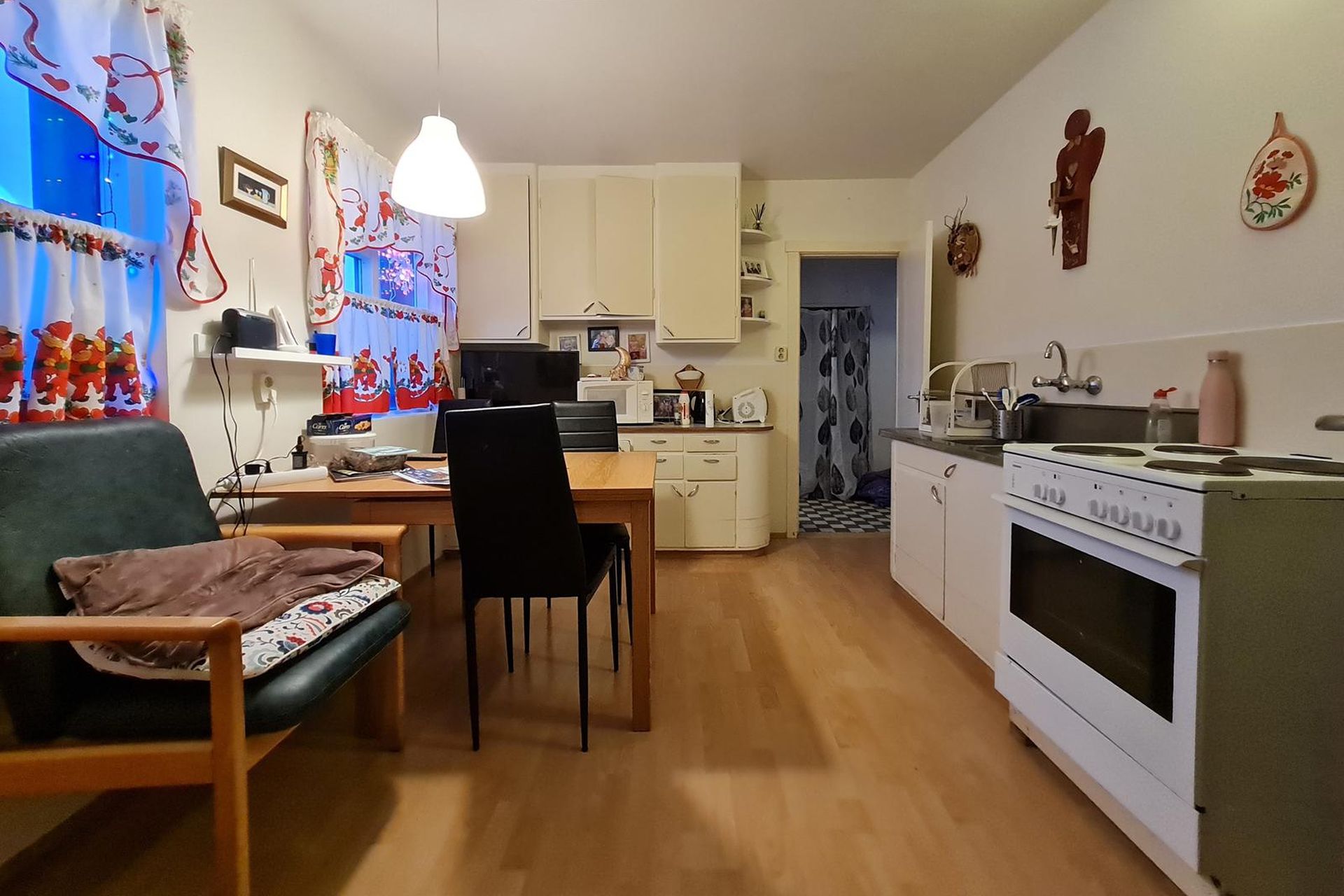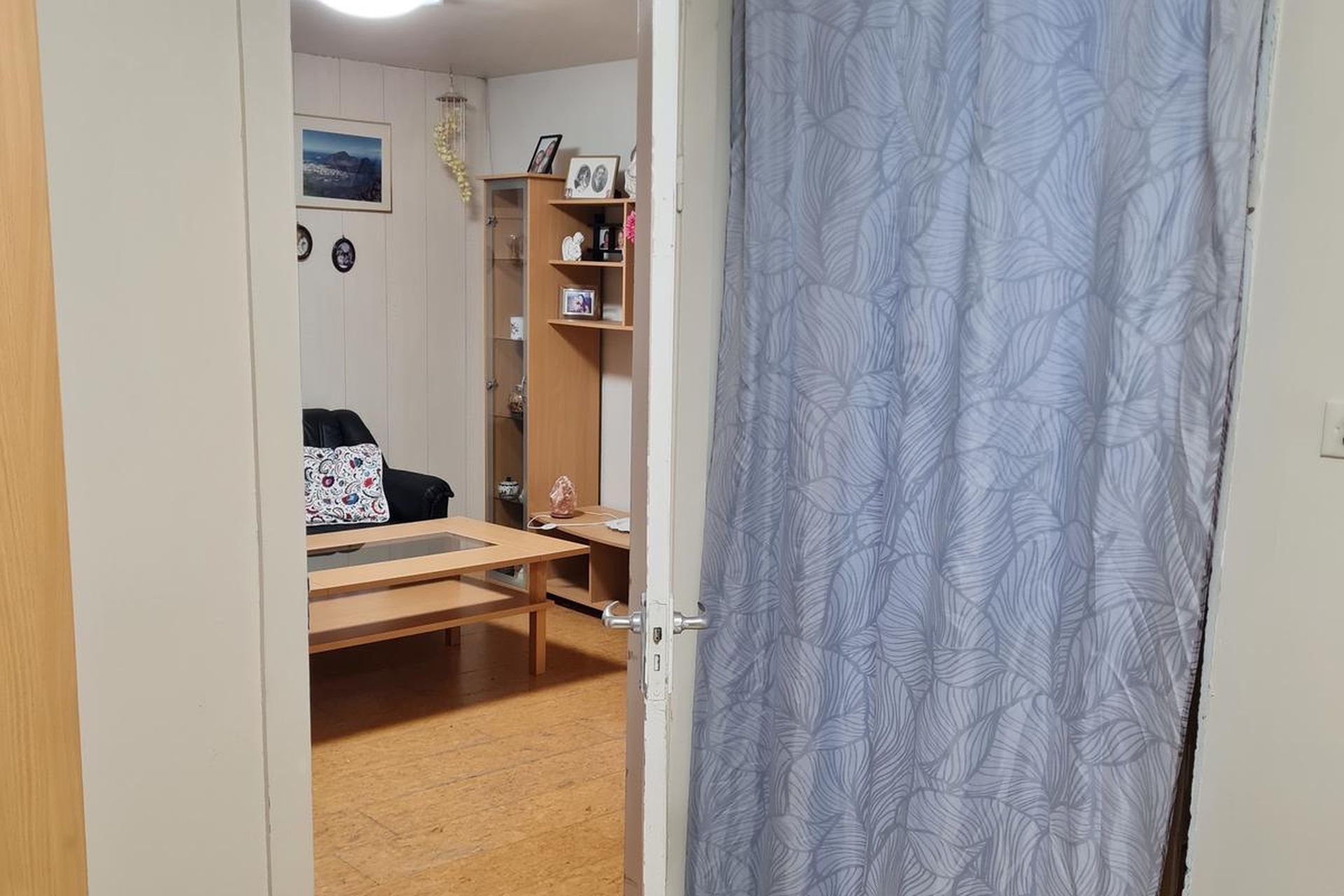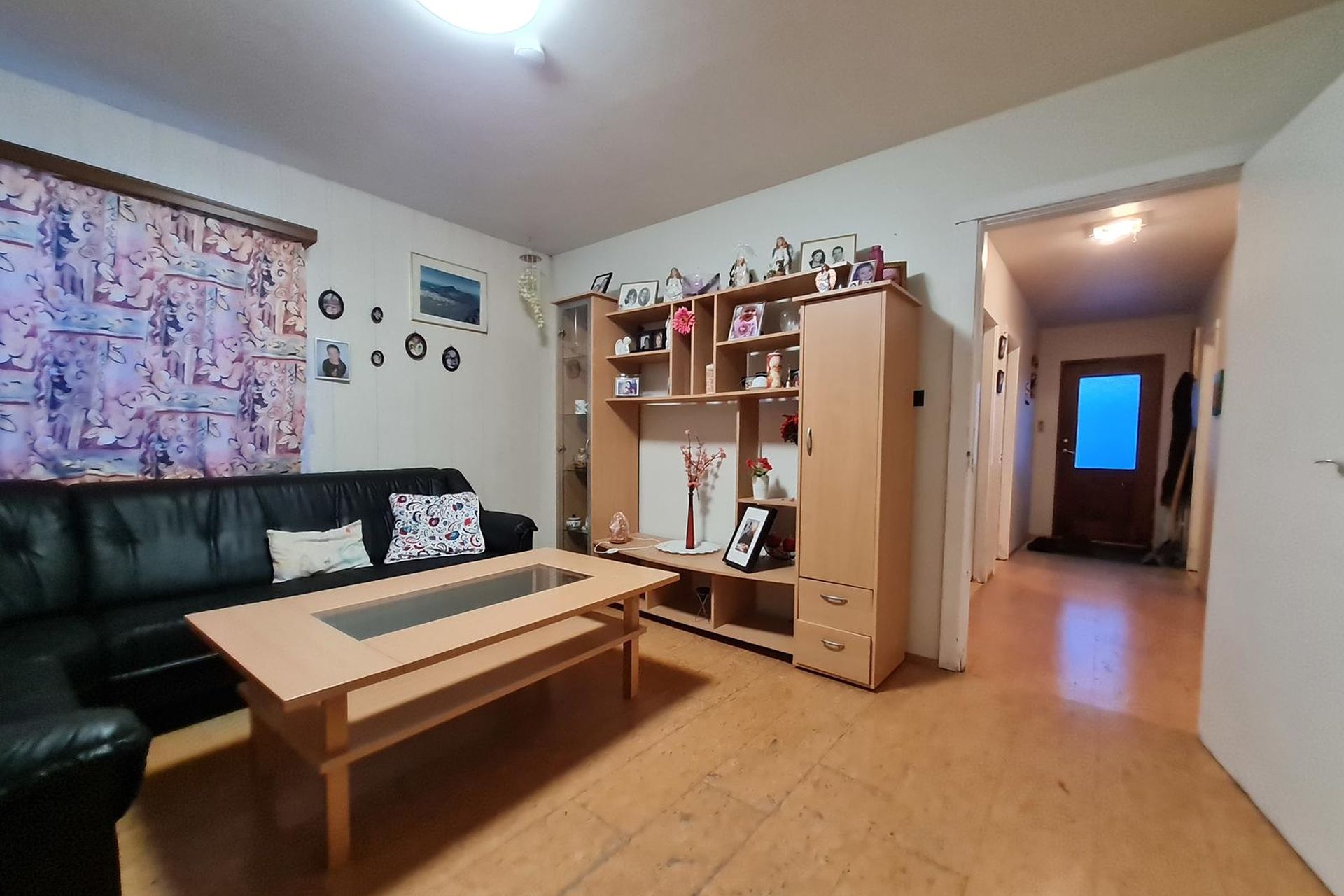 Stofa er parketlögð.