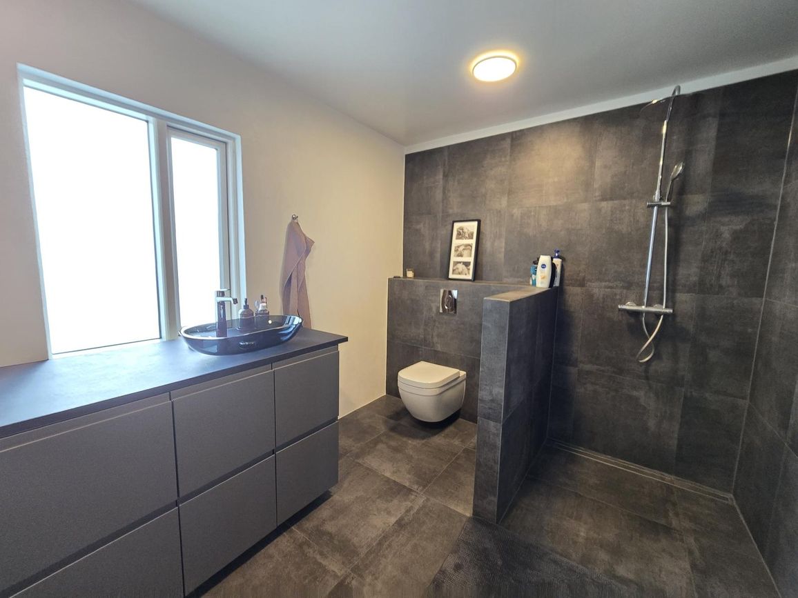 Rúmgott baðherbergi með flísum á gólfi og veggjum við sturtu. Góð grá innrétting með dökkri borðplötu og stæði fyrir þvottavél og þurrkara. Handklæðaofn og upphengt salerni.