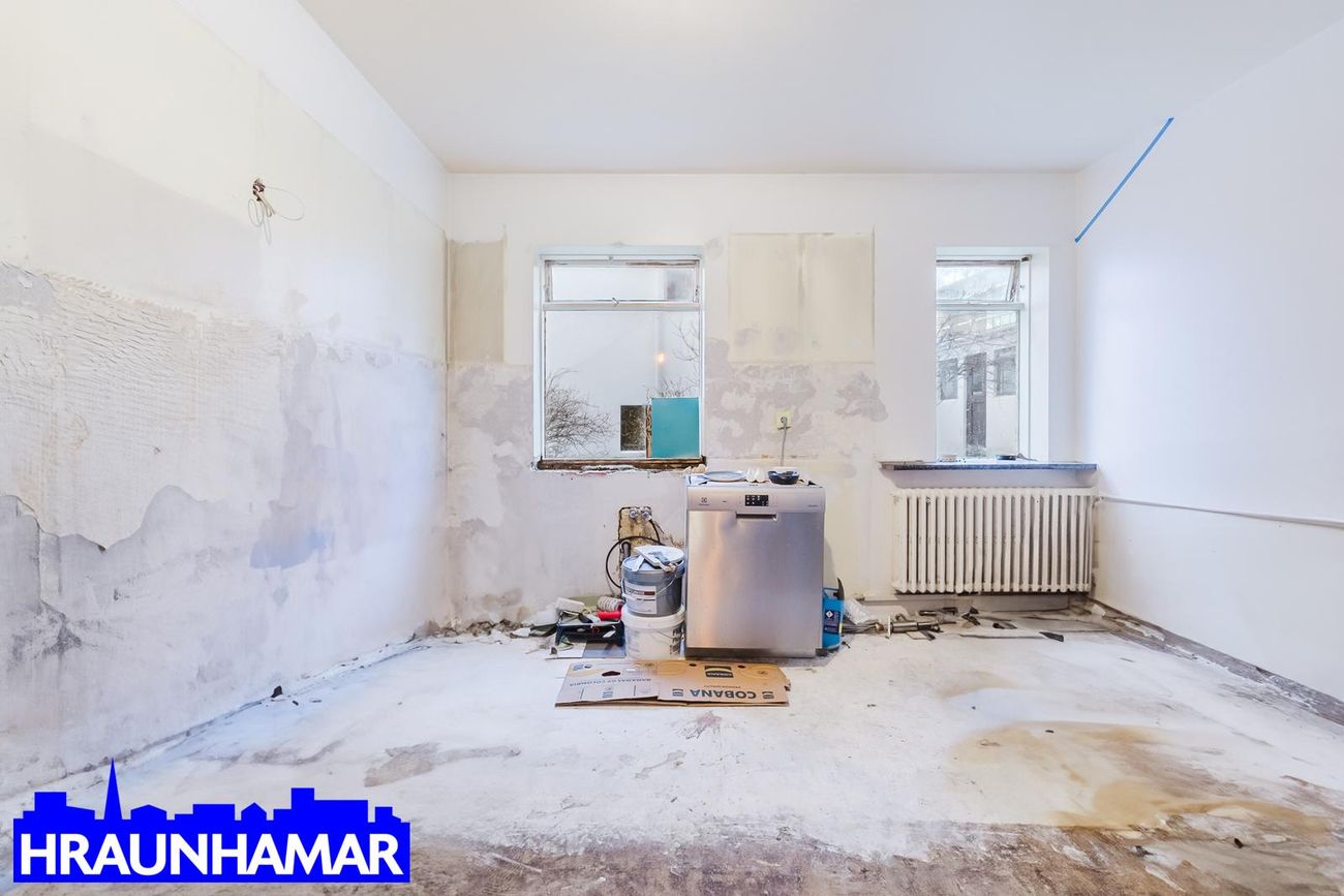 Eldhús tilbúið fyrir nýjar innréttingar og lausnir eftir smekk kaupanda. Eldhúsinnrétting og gólfefni hafa verið fjarlægð og býður rýmið upp á skemmtilegt tækifæri til að hanna sérsniðið eldhús.