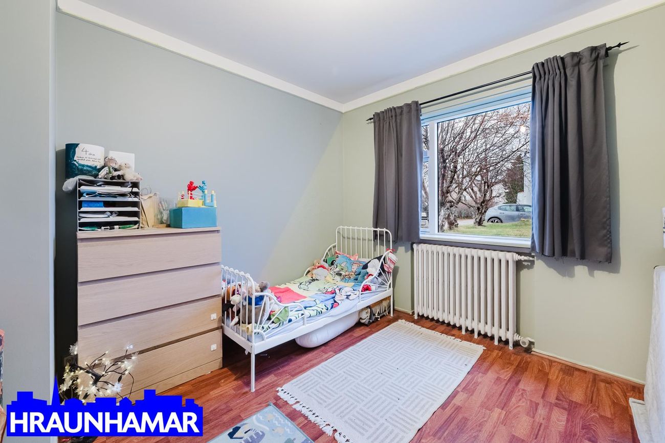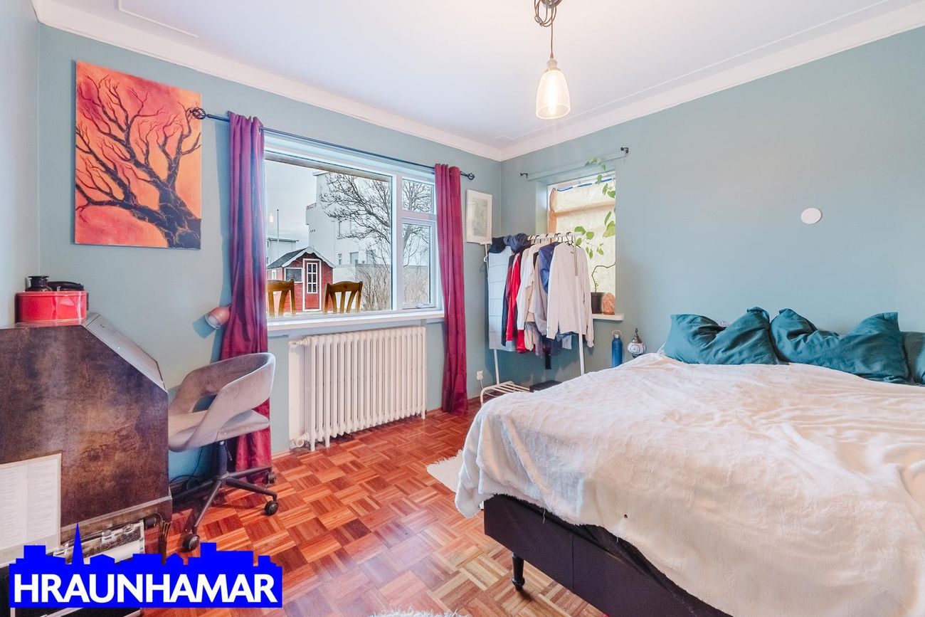 Svefnherbergi harðparket á gólfi.