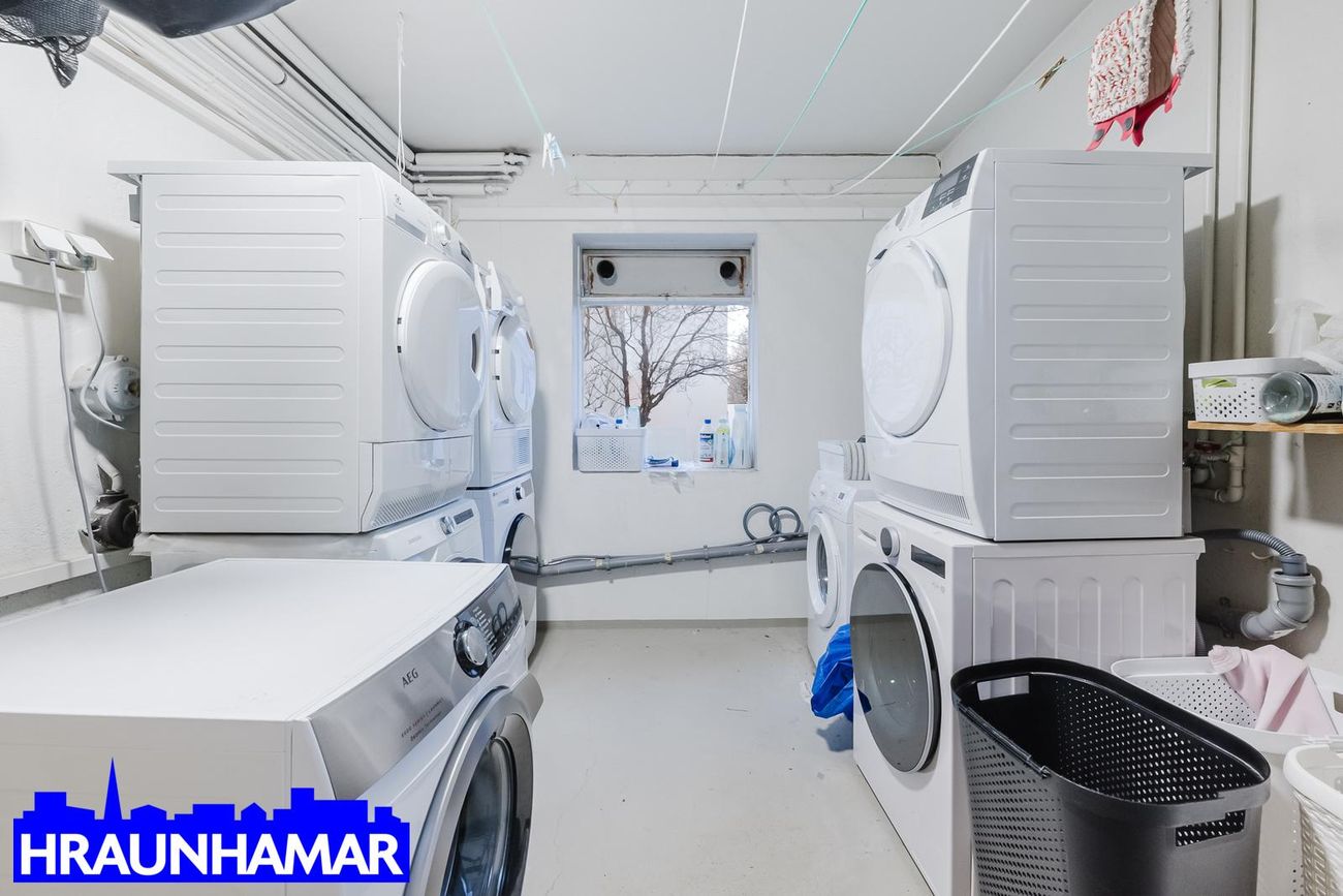 Þvottahús sameiginlegt með máluðu steingólfi.