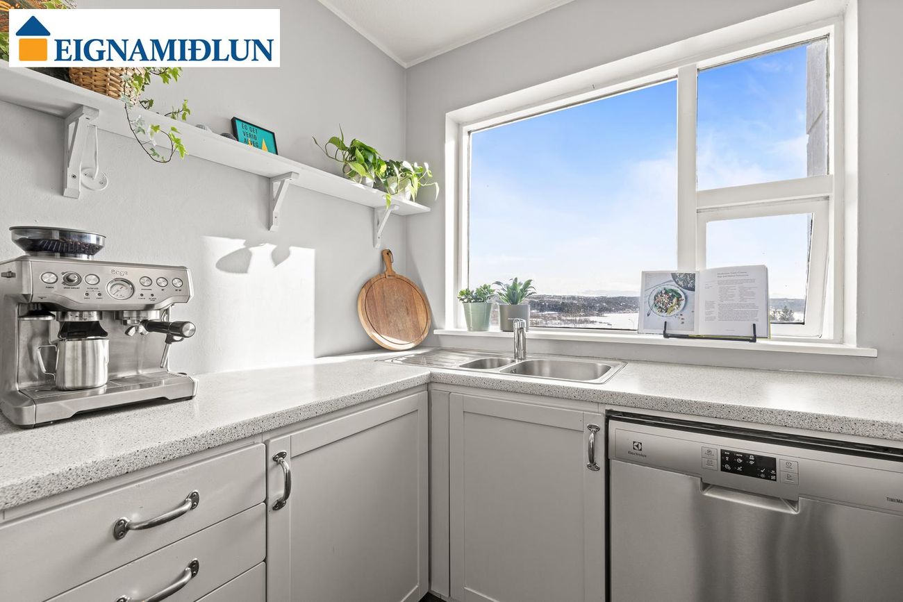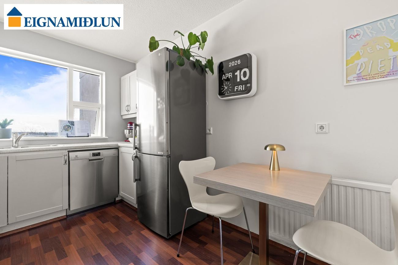 Eldhús með parketi og borðkrók. Eldhúsið er bjart og með útsýni yfir Rauðavatn.
