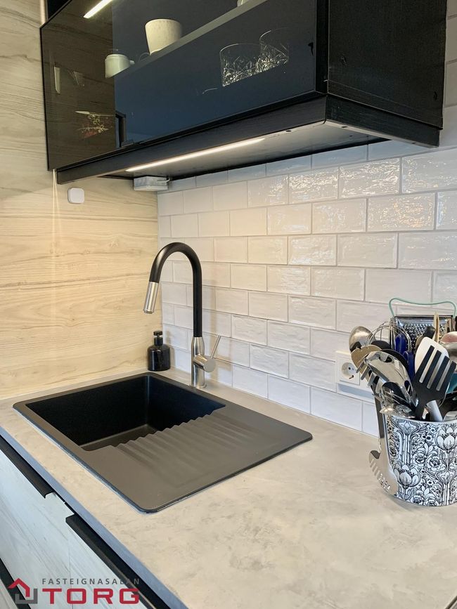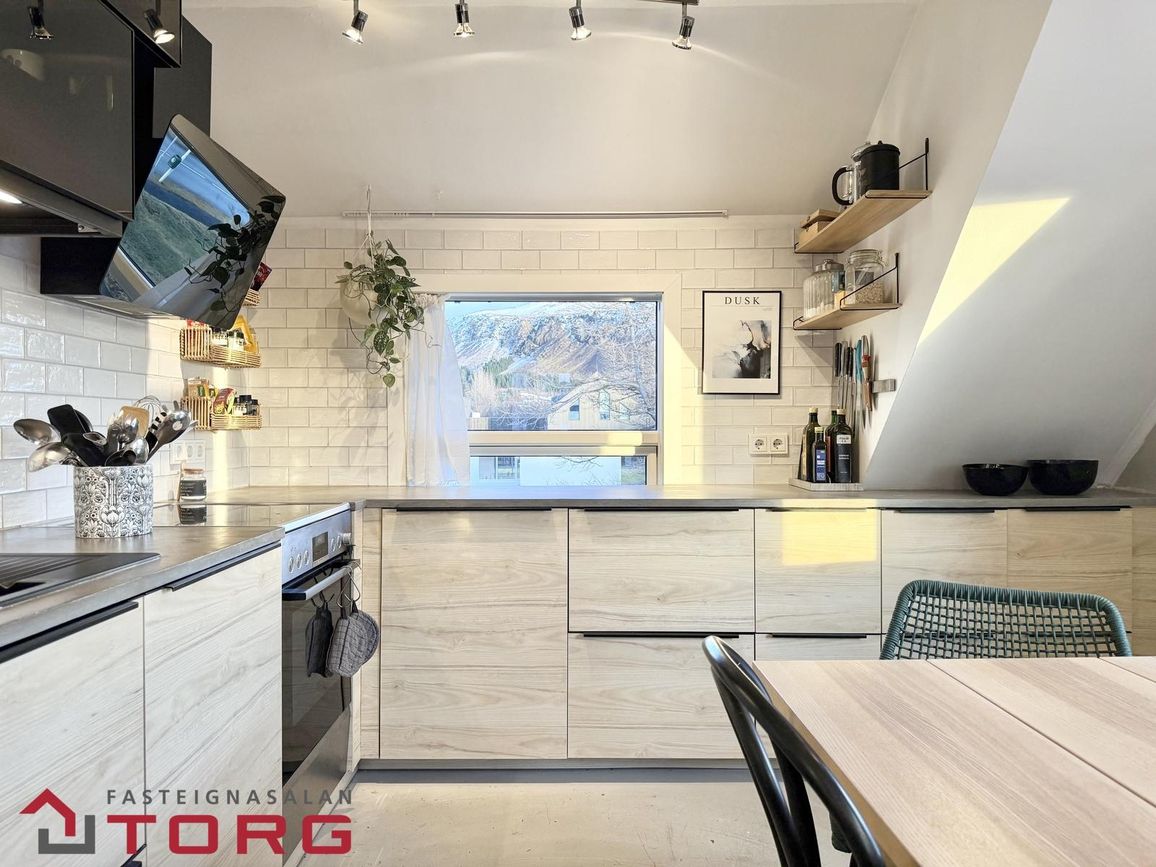 Bjart eldhús með endurnýjaðri innréttingu, svörtum efriskáp með innbyggðri lýsingu, innbyggðri uppþvottavél, eldavél, ofni og gufugleypi. Gluggar með opnanlegu fagi og flot á gólfi.