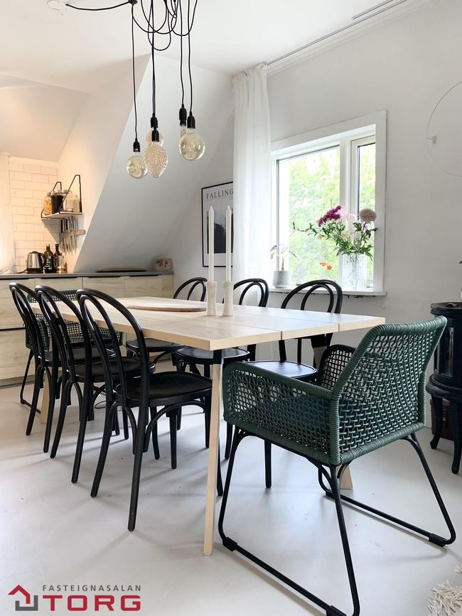 Endurnýjað eldhús með viðaráferð, svörtum efriskáp, innbyggðri uppþvottavél, eldavél, ofni og gufugleypi. Bjartur borðkrókur með plássi fyrir borð.