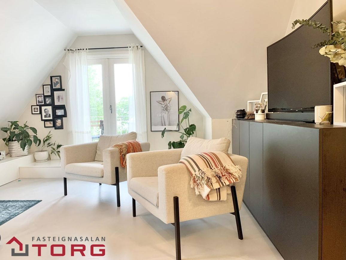 Rúmgóð og björt stofa með floti á gólfi og útgengi á suðursvalir með útsýni yfir garðinn.