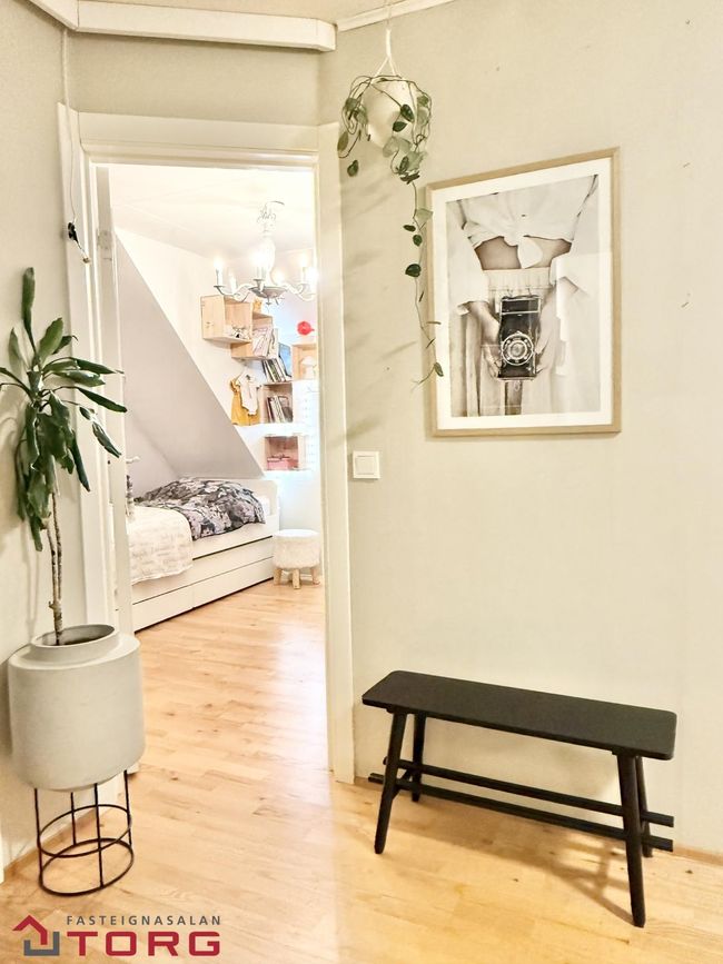 Parketi í svefnherbergjum og holum, flot í stofu og eldhúsi, flísalagt baðherbergi.