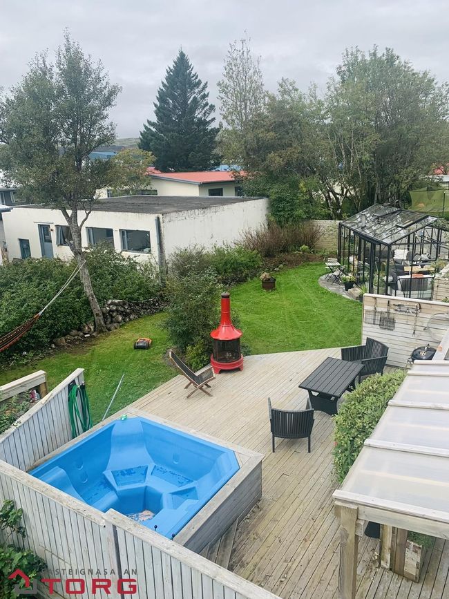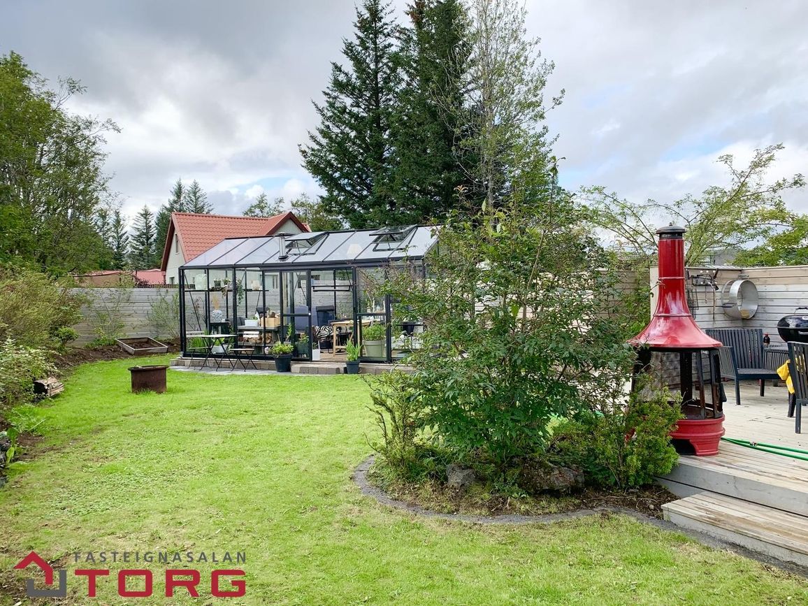 Stór gróinn og afgirtur garður með hellulagðum stíg, heitum potti, sólskála og nýjum geymsluskúr.