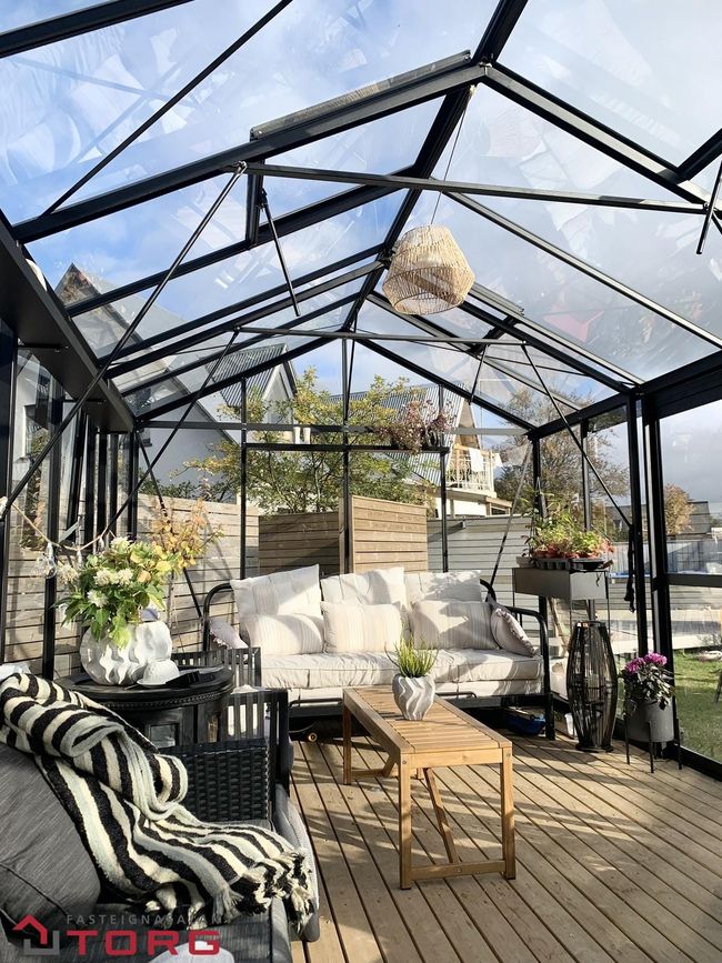 Sólskáli/gróðurhús notaður sem aukastofa og lítið herbergi notað sem vinnuaðstaða.