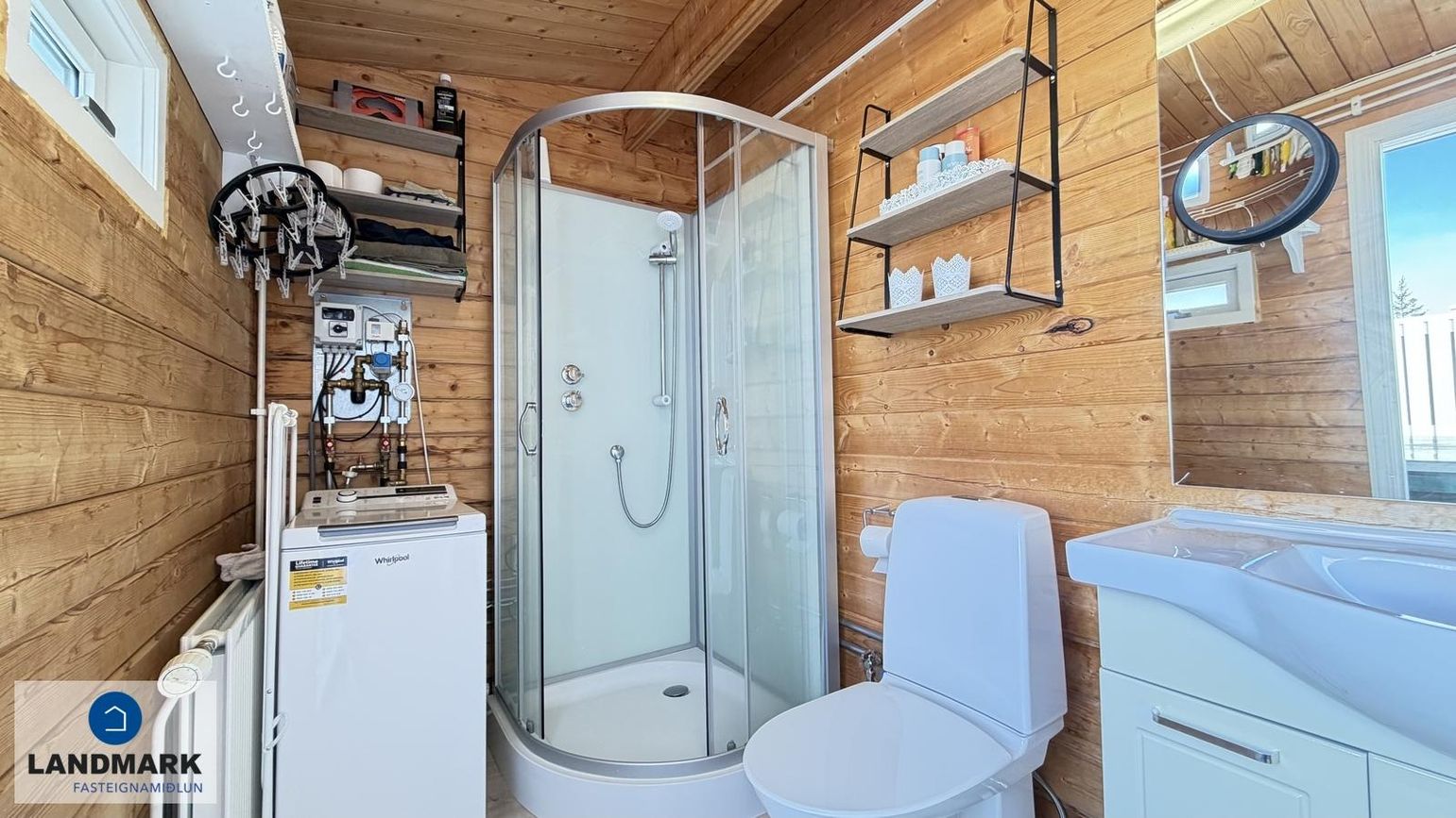 Tvö rúmgóð svefnherbergi eru í húsinu. Nýleg eldhúsinnrétting með bakarofni, helluborði, gufugleypi og innbyggðri uppþvottavél. Húsgögnin eru einnig nýleg og fylgja með í kaupum, þ.á.m. þrjú rúm, flatskjár, ísskápur, þvottavél, vandað stækkanlegt borðstofuborð og sófi ásamt öðrum húsgögnum fyrir utan persónulega muni. ✅ Fallegur og sjarmerandi 50 fm heilsárs sumarhús í Varmahlíð
