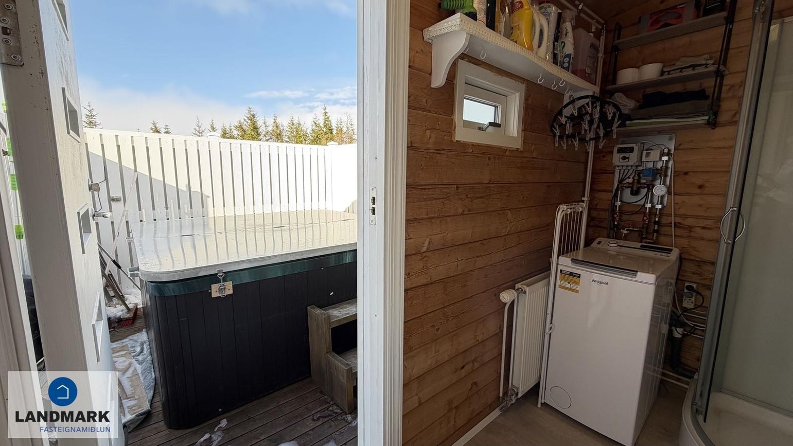 Baðherbergi: Með salerni, sturtuklefa og baðinnréttingu, harðparket á gólfi. Útgengi á pall þar sem heitur pottur er afgirtur.