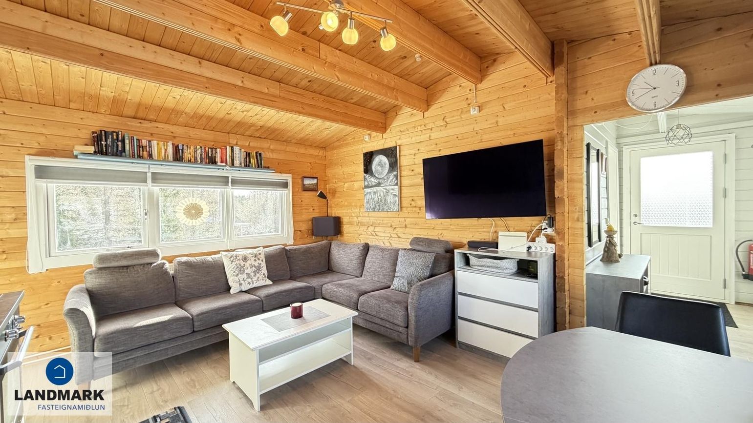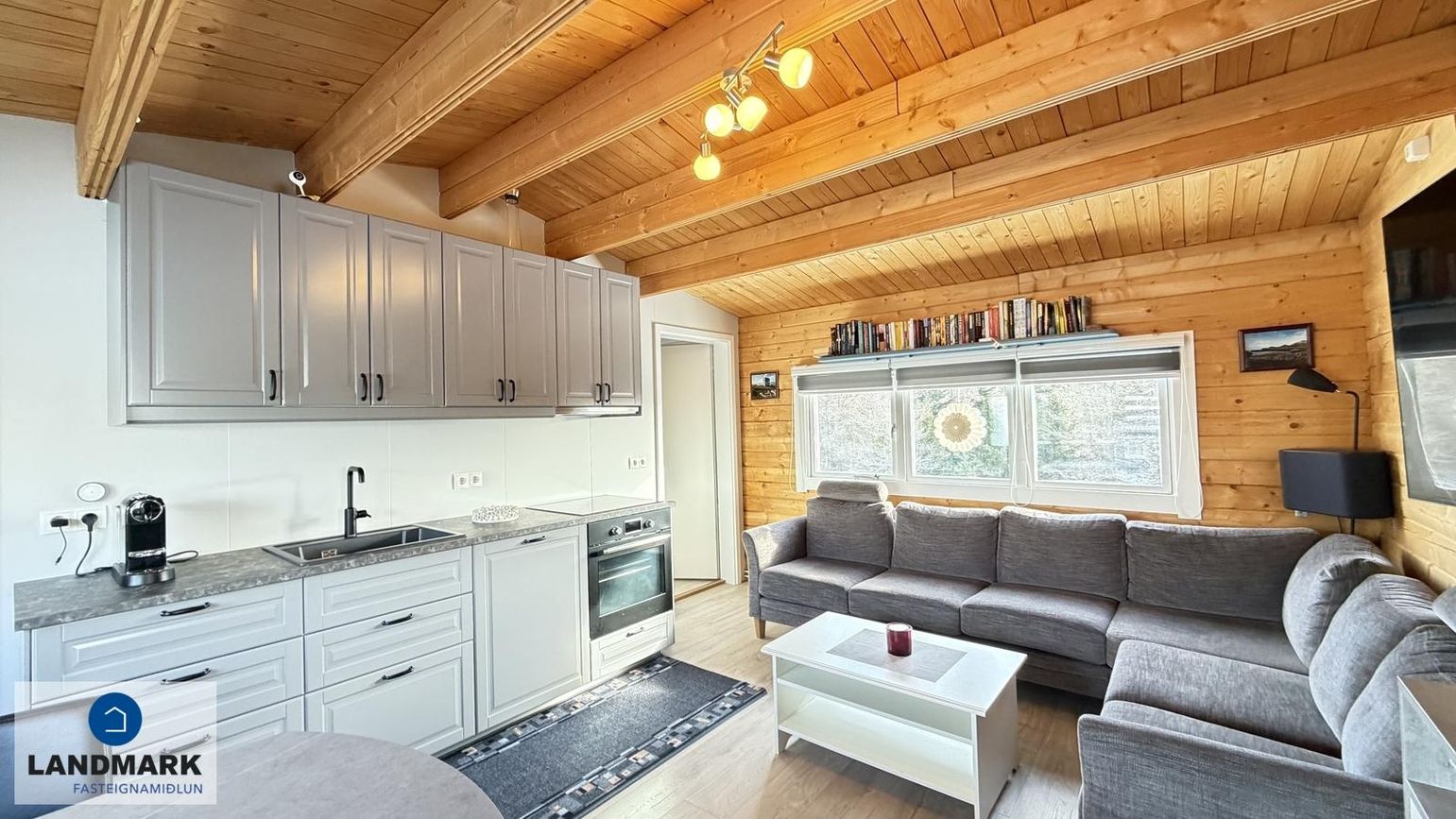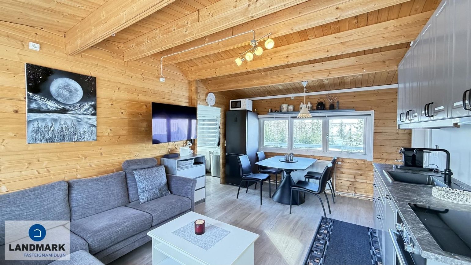 Alrými: Með eldhúsi og stofu, harðparket á gólfi. Grár hornsófi, áfastur flatskjár á vegg, ísskápur, vandað borðstofuborð sem er stækkanlegt.