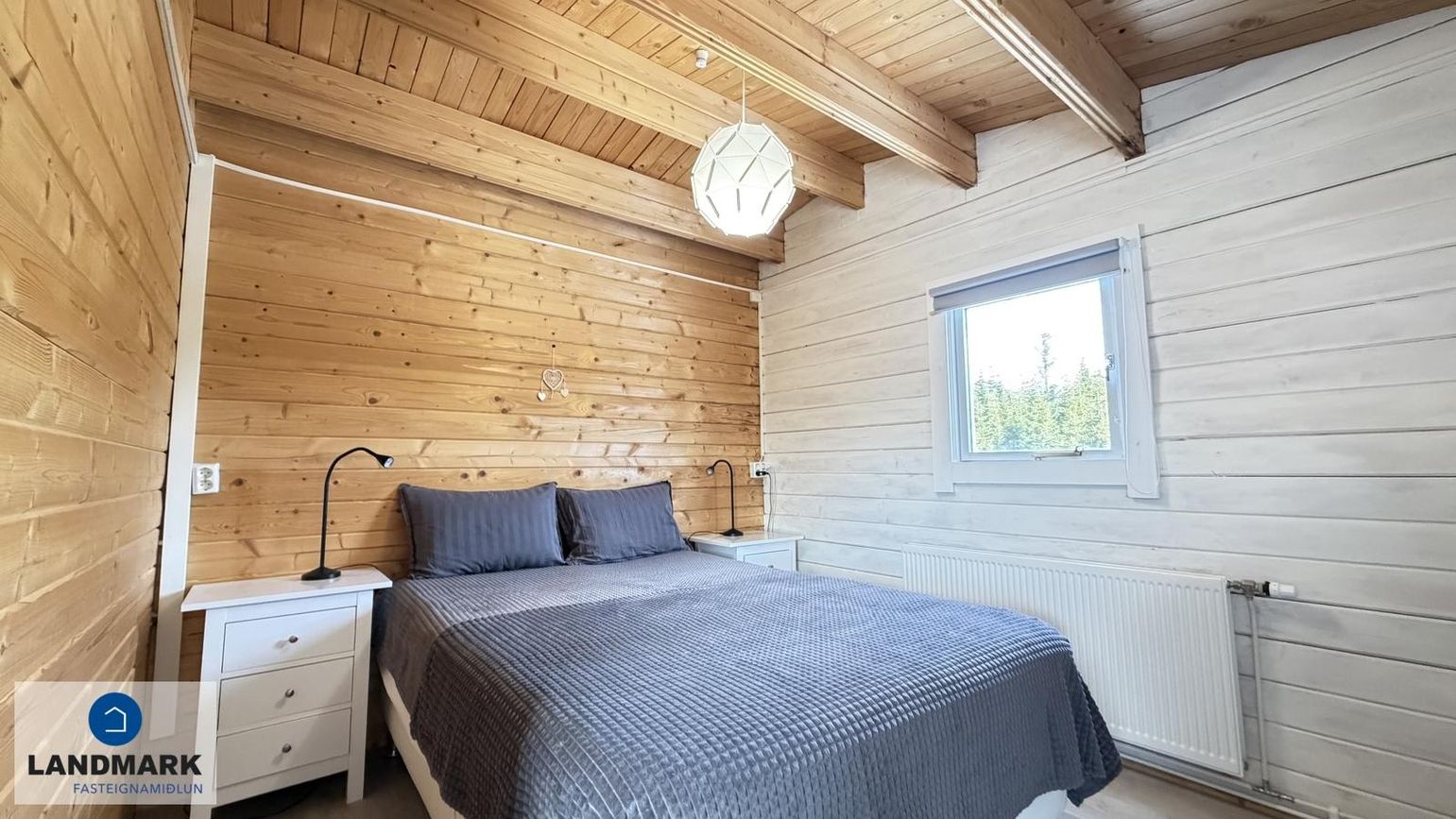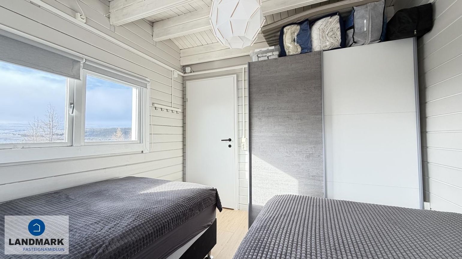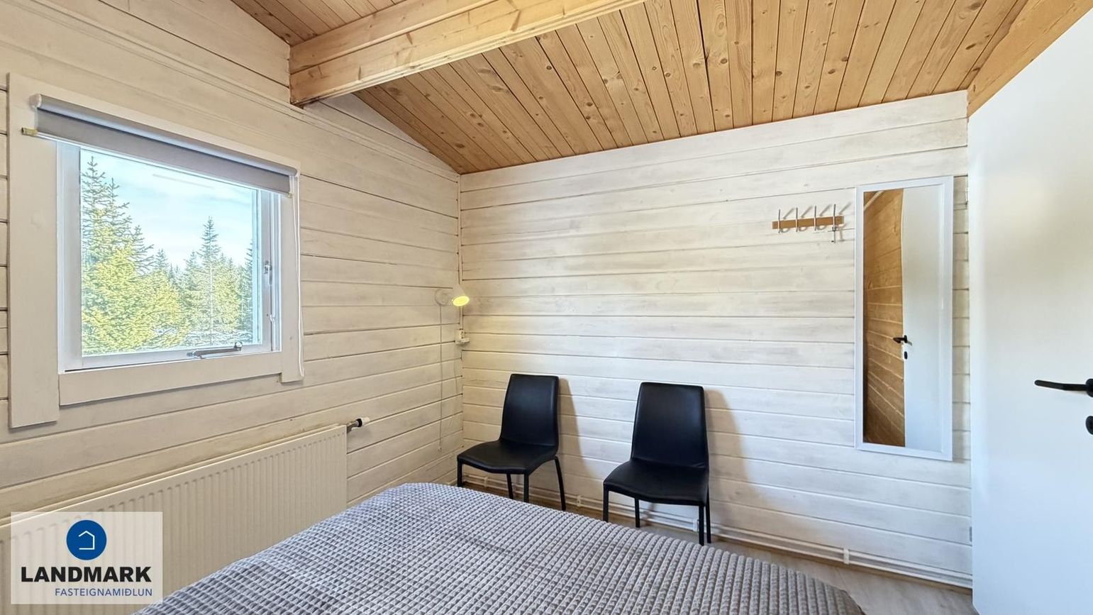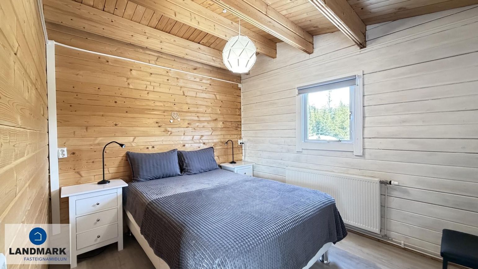 Svefnherbergi II: Innaf alrými, rúmgott, harðparket á gólfi. Gott tvíbreitt rúm.