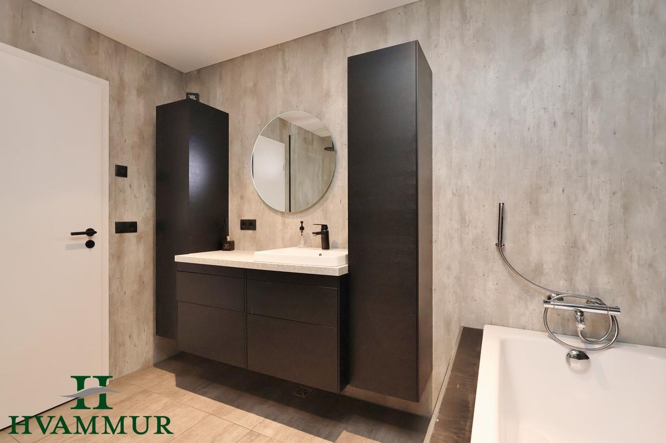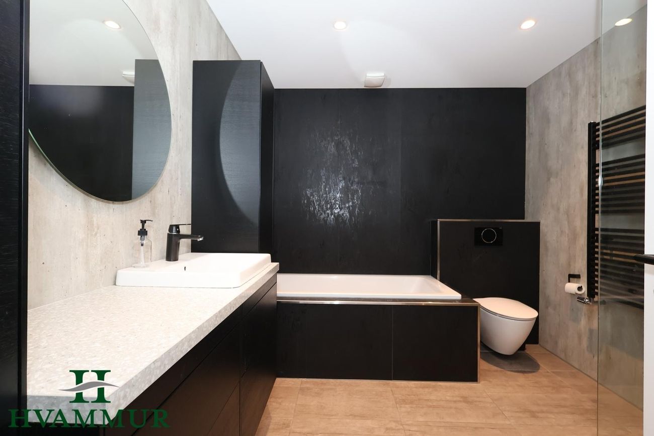 Aðalbaðherbergi með flísalögðu gólfi, Fibo trespo plötum á veggjum, svörtri innréttingu, baðkari og walk-in sturtu. Annað baðherbergi með walk-in sturtu og handklæðaofni.