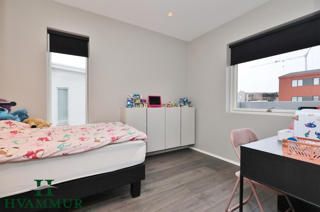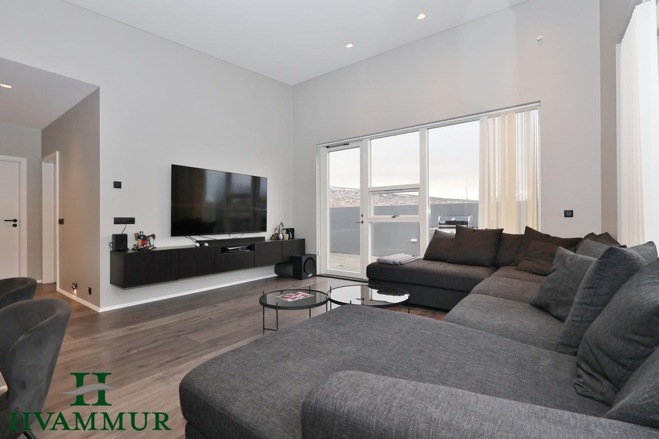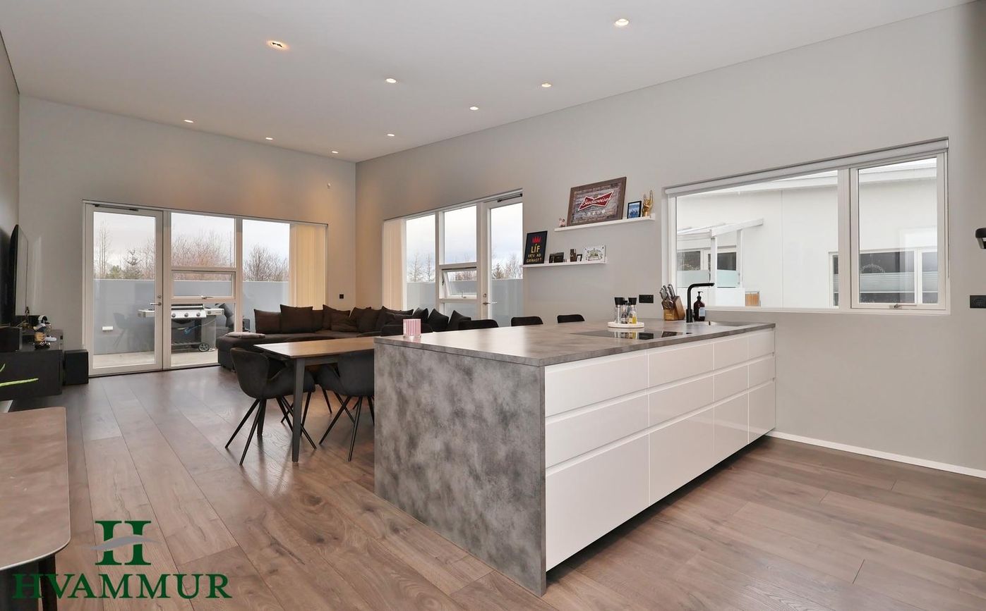 Opið og bjart alrými með aukinni lofthæð, harðparket á gólfi, stórum gólfsíðum gluggum og gönguhurð út á steypta verönd. Innfelld lýsing og dúkur í lofti.
