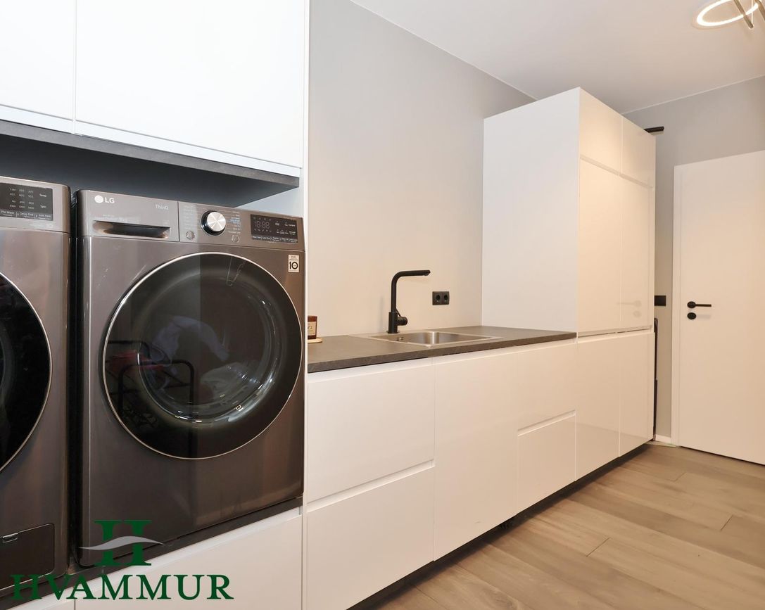 Þvottahús með harðparketi, stórri hvítri innréttingu með vaska og innbyggðum frystiskáp. Lítið geymsluloft við endann.