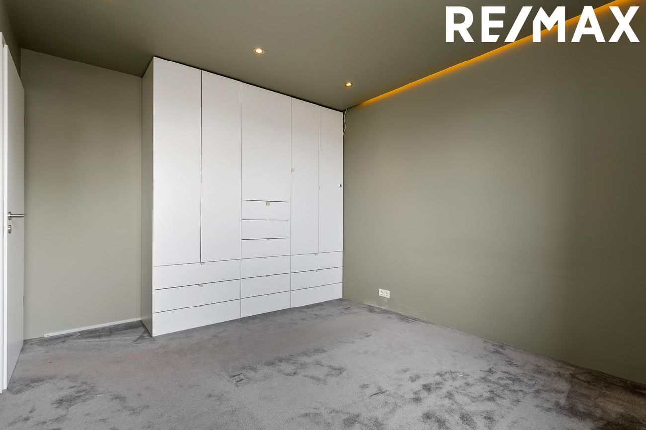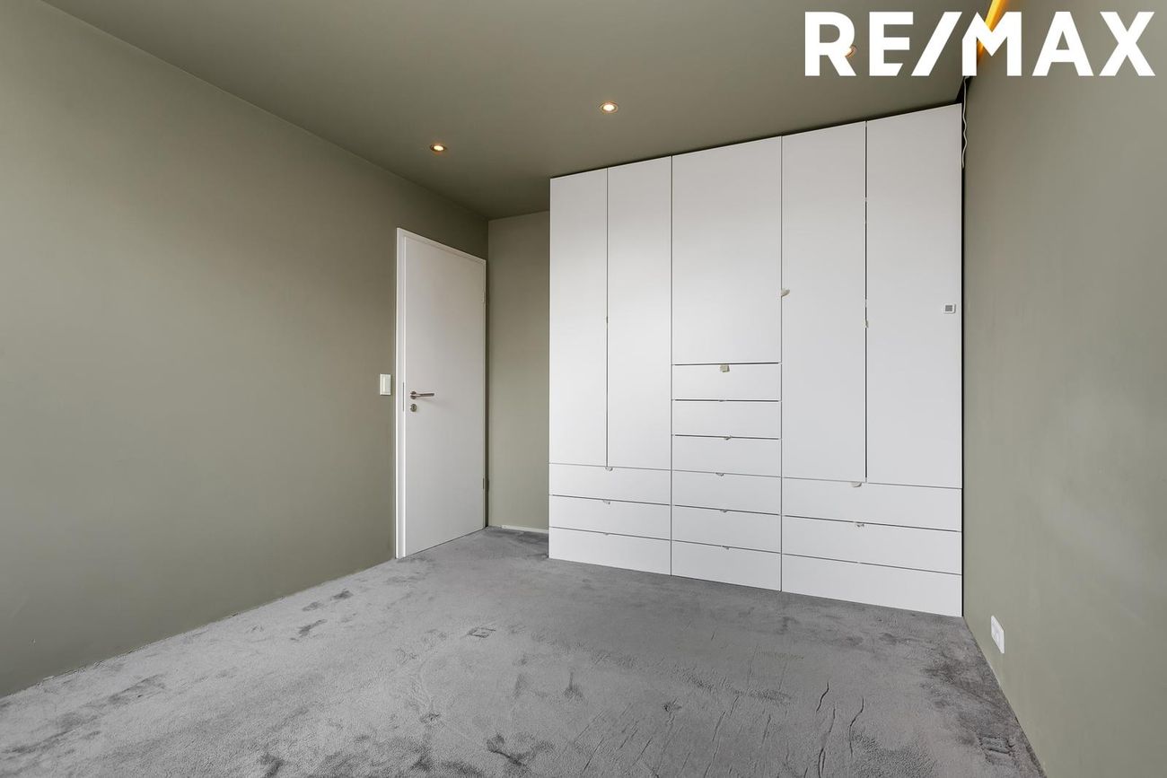 Hjónaherbergið er með teppi á gólfi og rúmgóðum skáp.