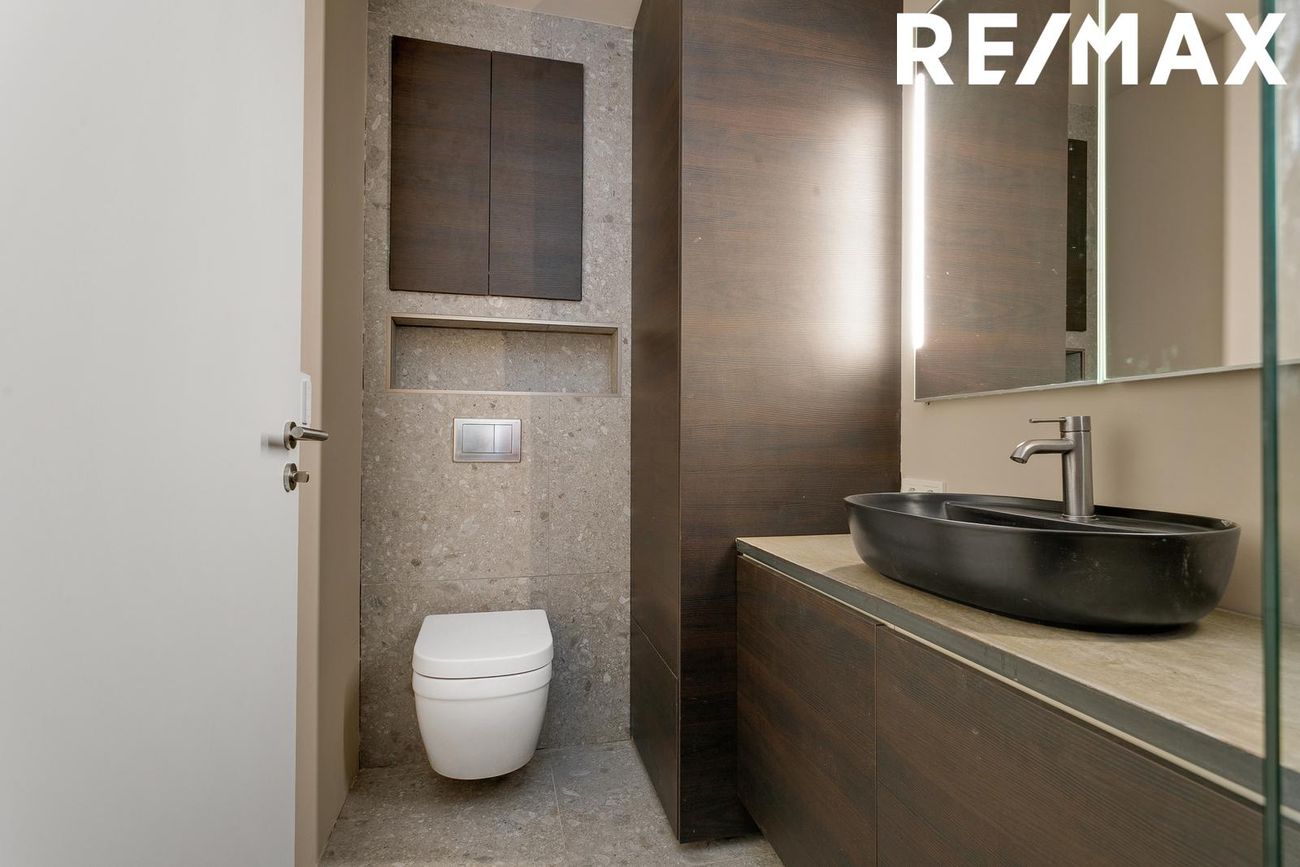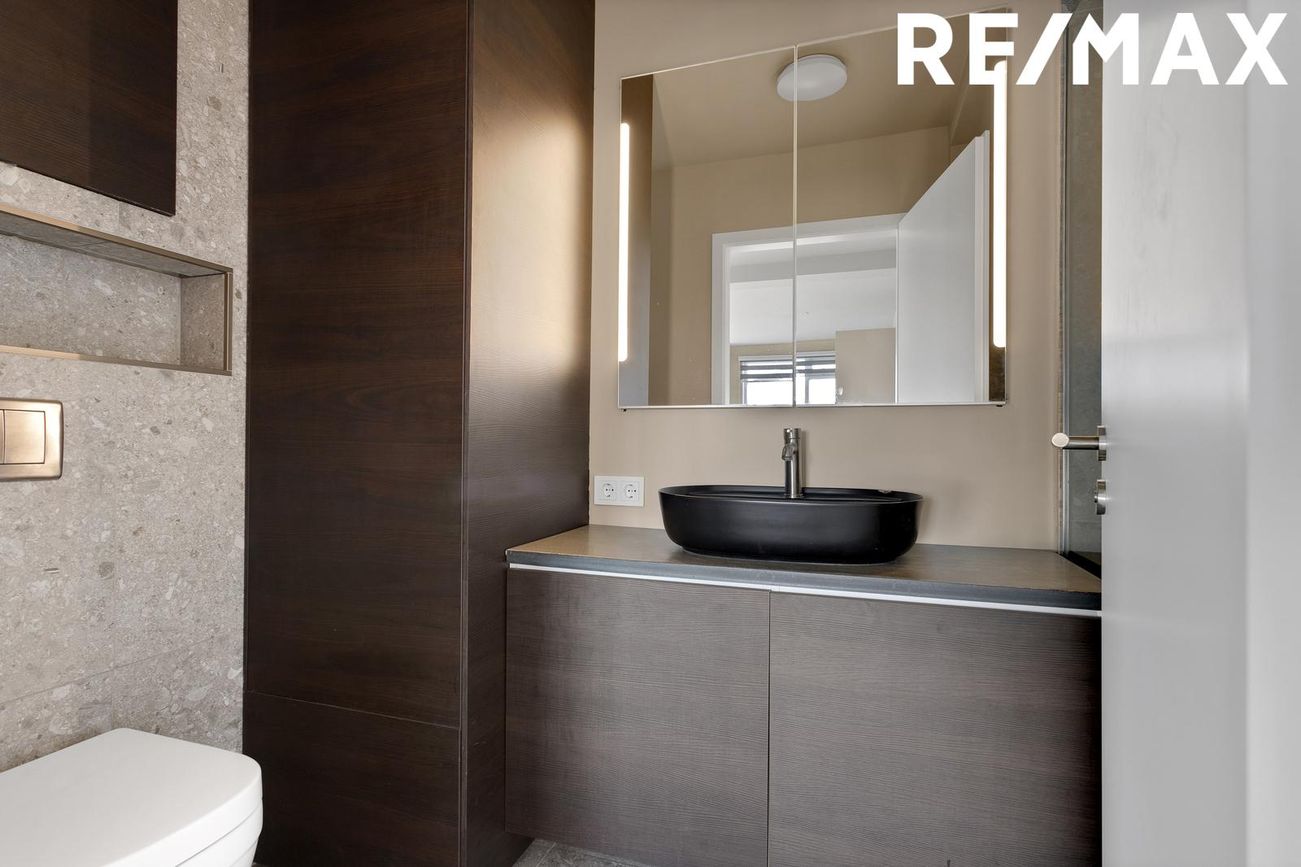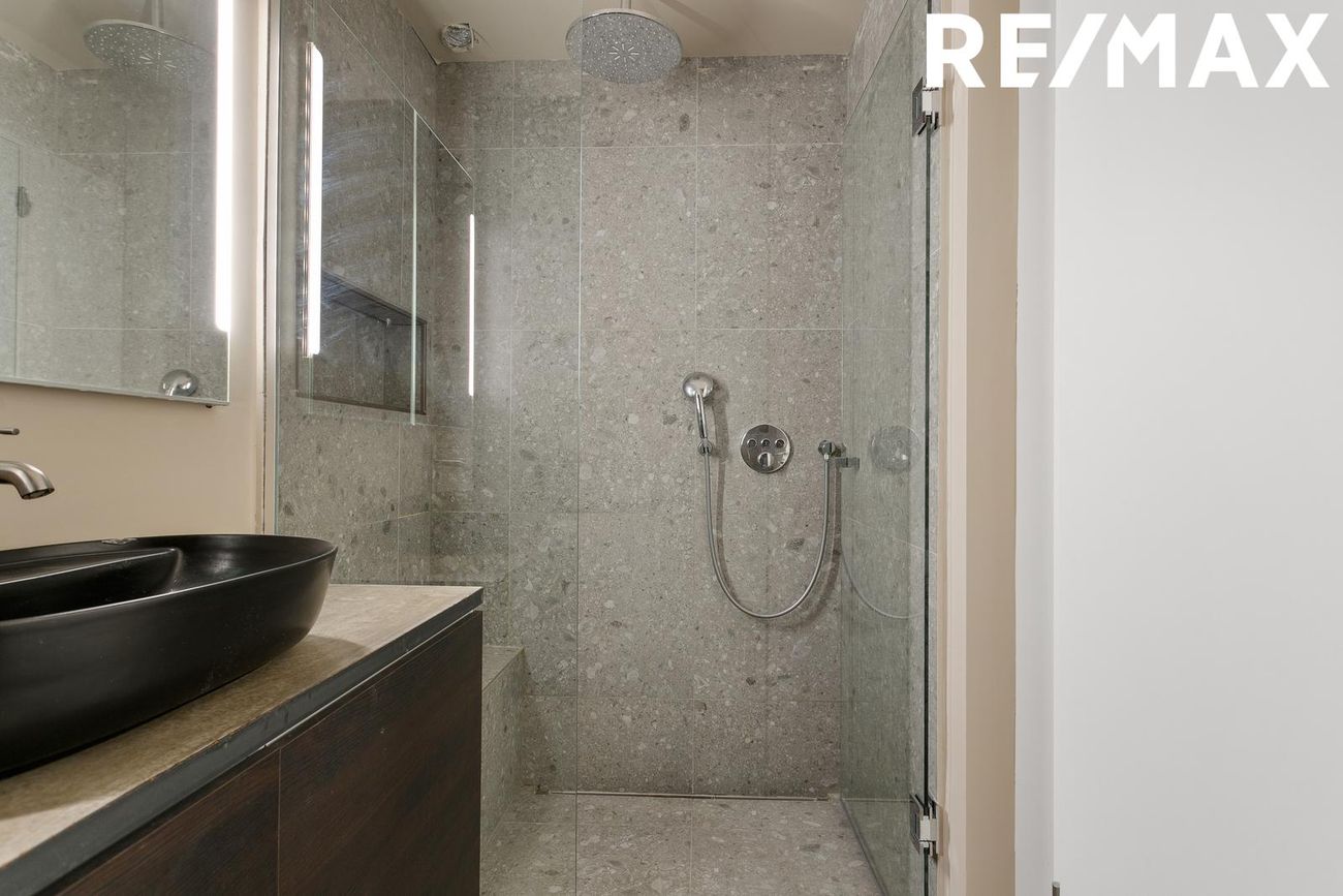 Baðherbergið er með fallegum flísum á gólfi. Upphengt salerni með walk-in sturtu. Nýleg dökk innrétting með vaski. Tengi fyrir þvottavél og þurrkara.