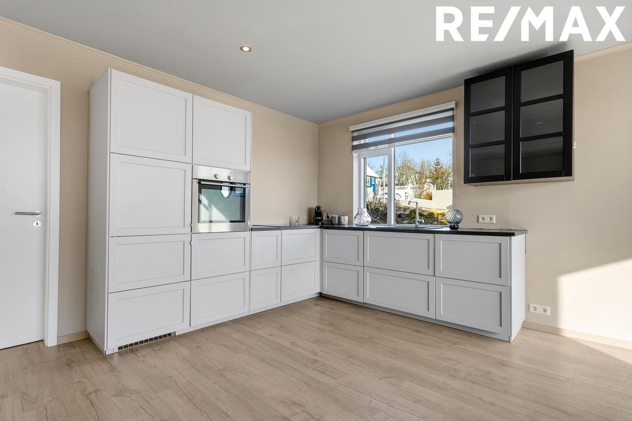 Eldhúsið er með nýlegri hvítri innréttingu. Innbyggð uppþvottavél og ísskápur ásamt span helluborði og ofn í vinnuhæð.