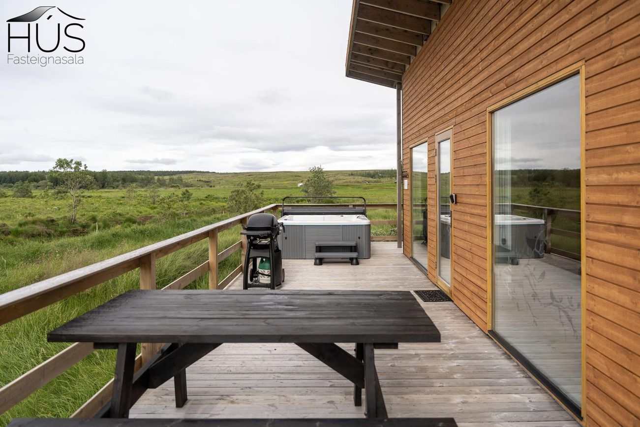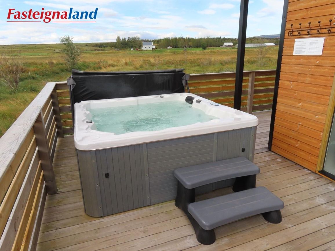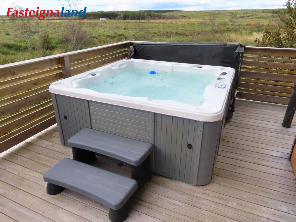 Góður pallur með handriðið. Heitur pottur.