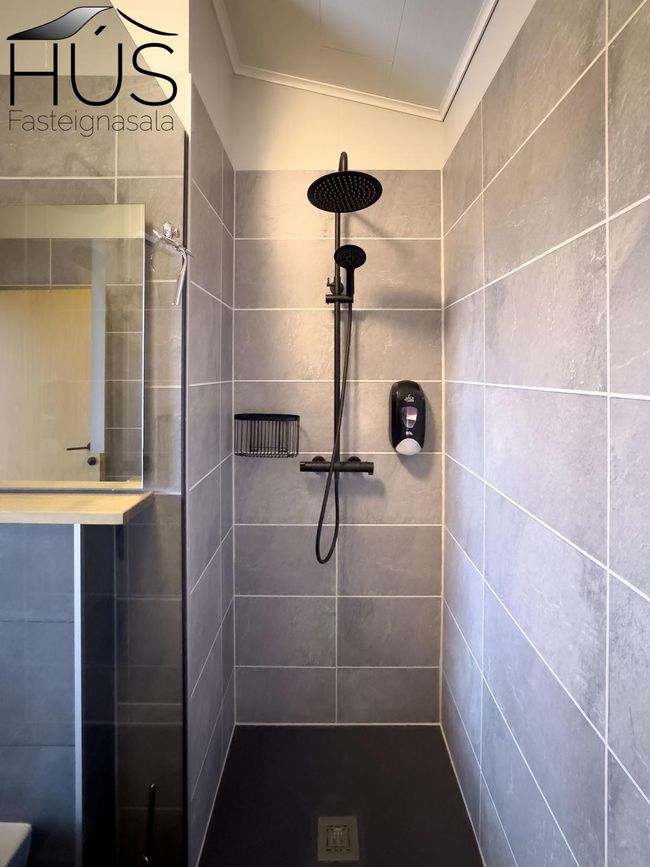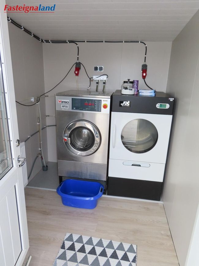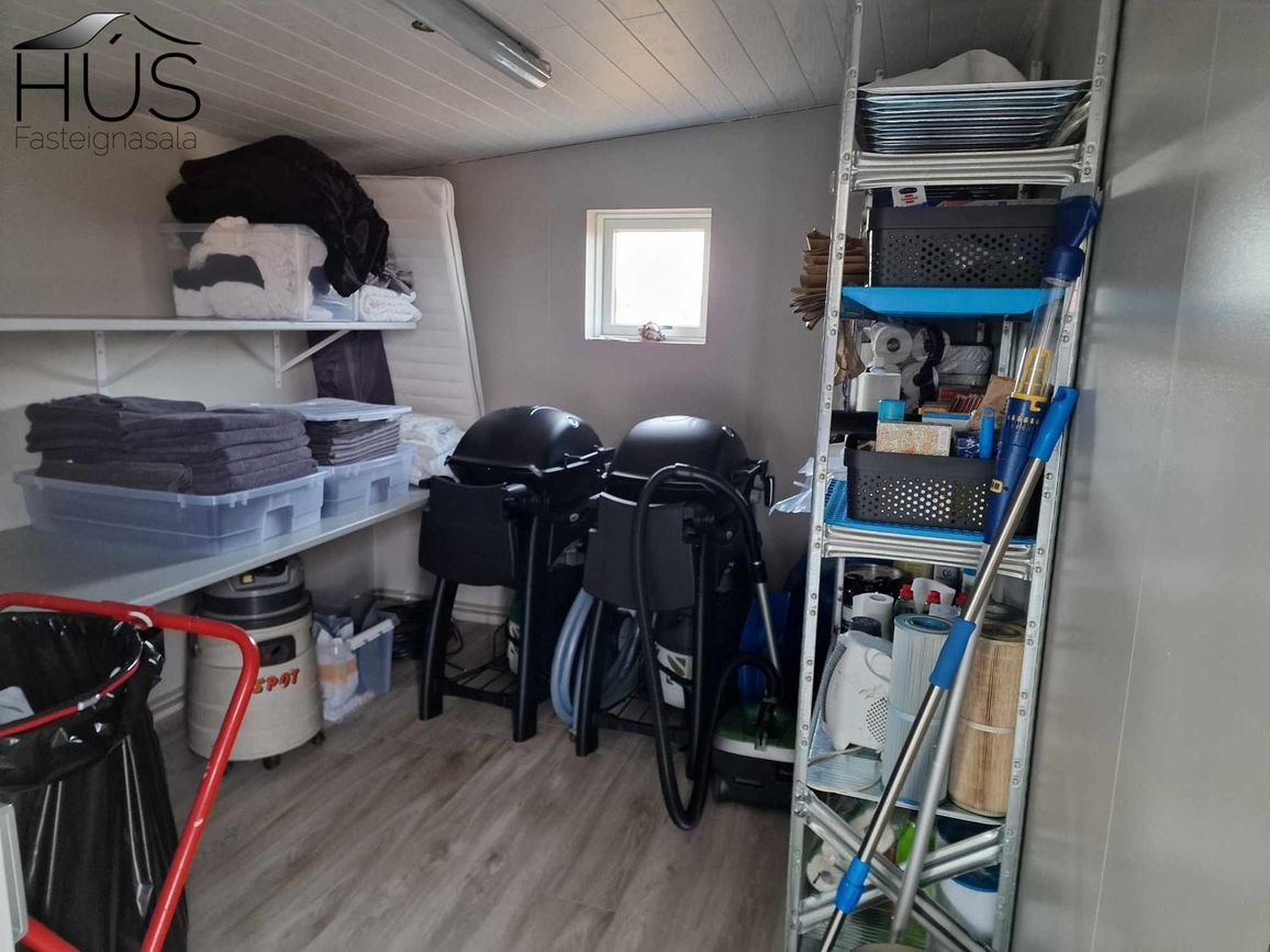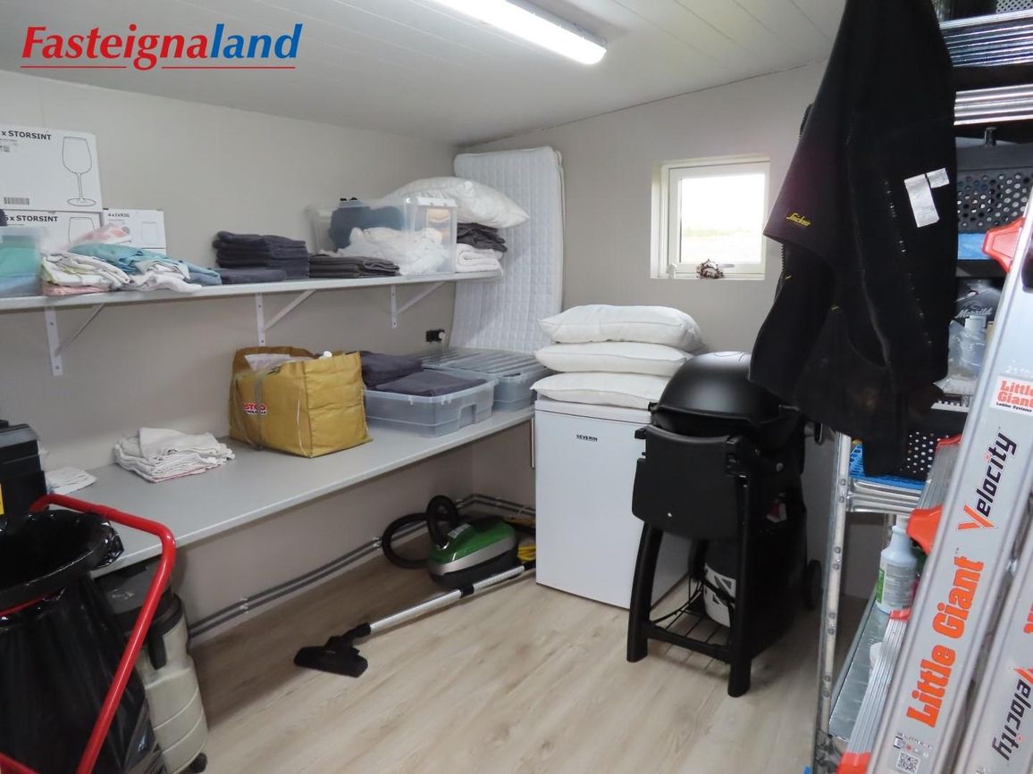 Geymsla: Um 15 fm tvískipt, annar hlutinn með þvottavélum og hinn hlutinn geymsla fyrir lín og með parketi á gólfi.