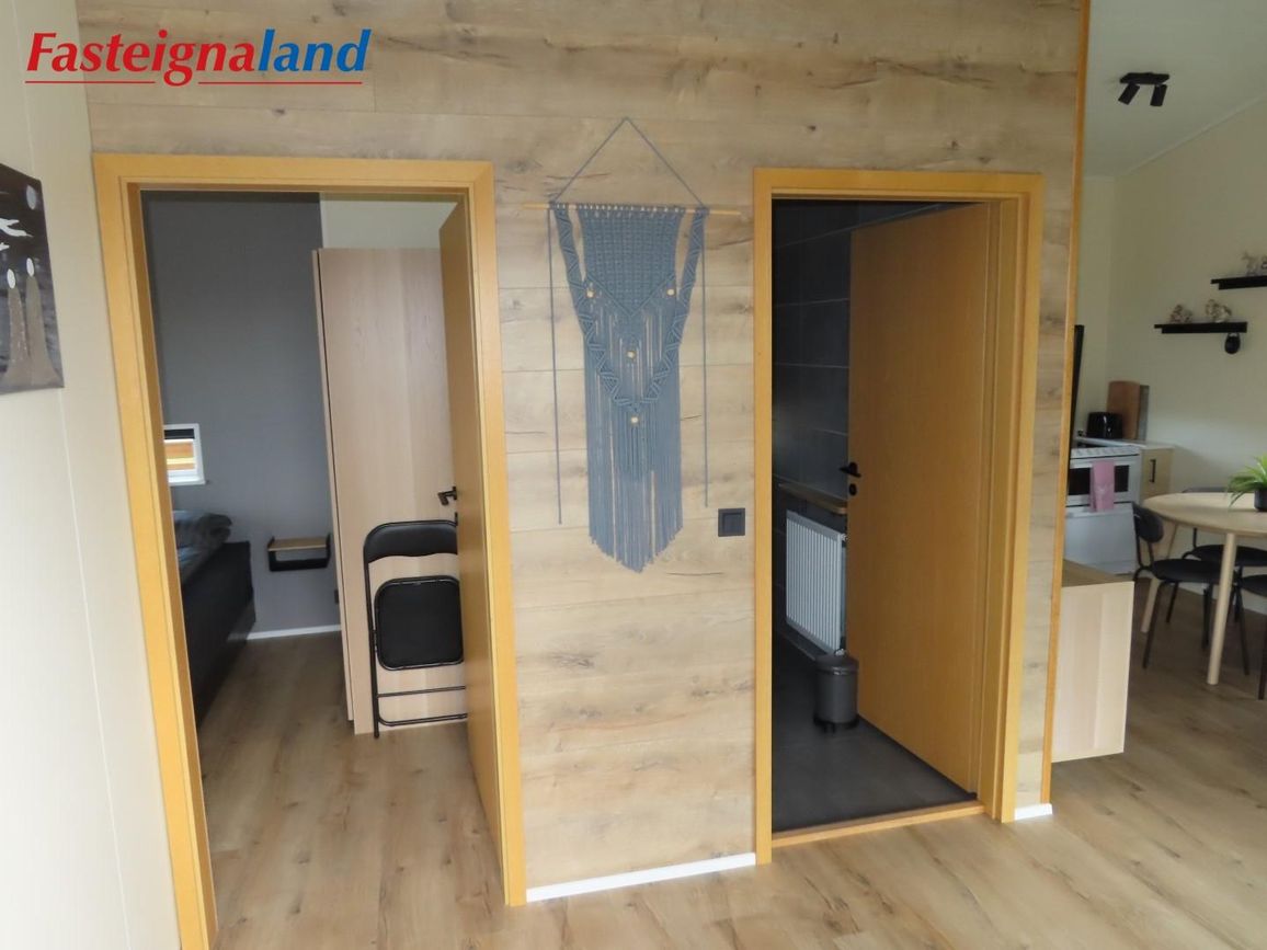 Lýsing á eigni nr. 2: Hús skráð 46. Komið inn alrými/stofu með parketi á gólfi. Tvö herbergi með parketi á gólfi. Annað með góðu skápaplássi. Baðherbergi með flísum á gólfi og fíbo plötum á veggjum, viðarinnréttingu og „walk in“ sturtu. Eldhús og stofa í sama rými L-laga með góðri lofhæð. Viðarinnréttingu og sambyggðri eldavél með kermik helluborði/uppþvottavél.