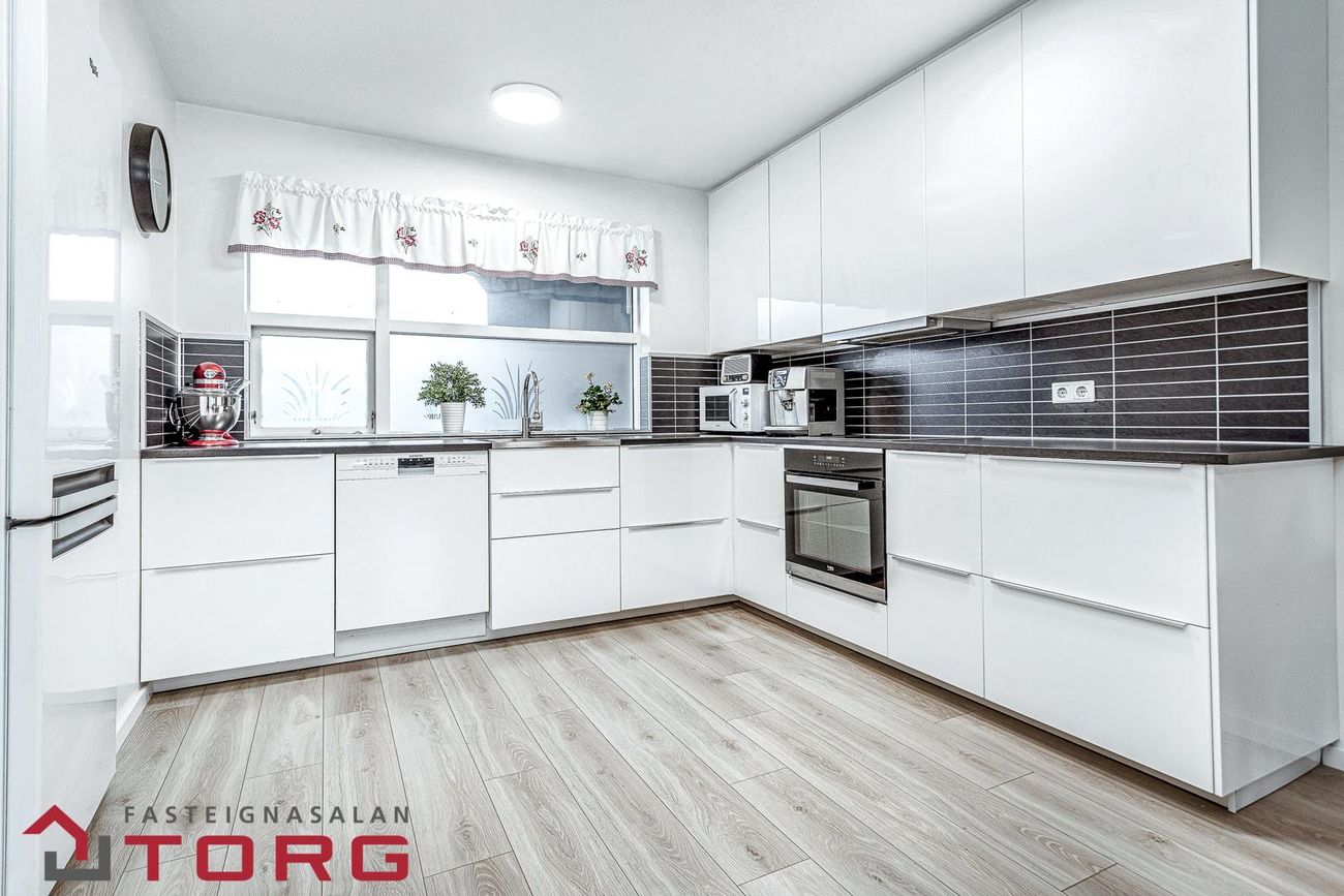 Eldhús er með fallegri innréttingu með góðu skápaplássi. Helluborð, vaskur, blástursofn og gert ráð fyrir uppþvottavél í innréttingu og stæði fyrir ísskáp.