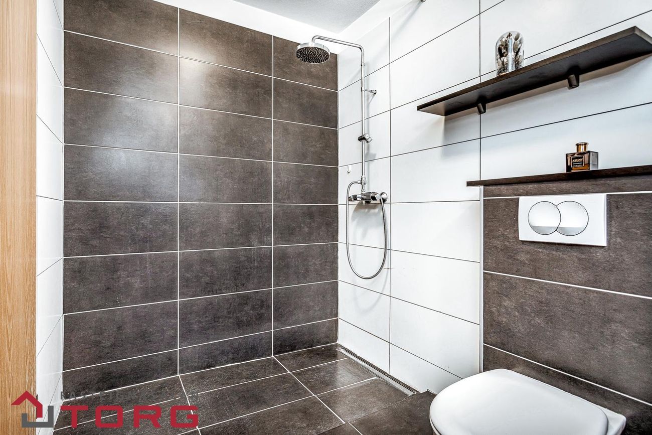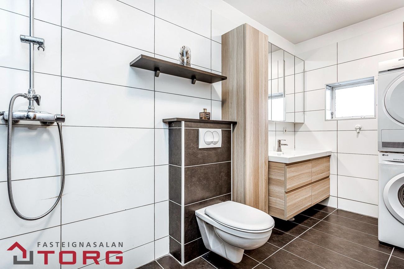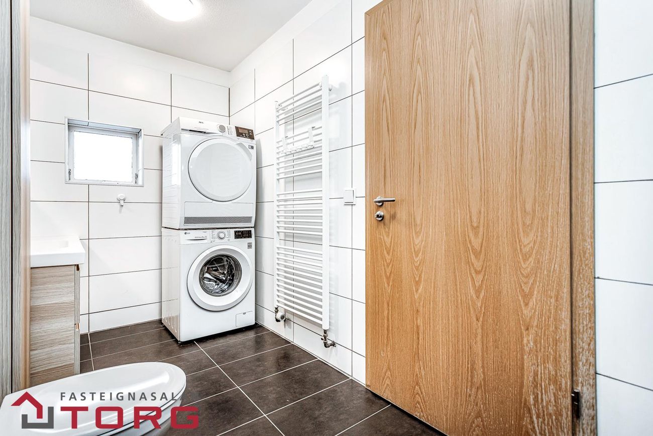 Baðherbergi er flísalagt með fallegri innréttingu við vask, upphengdu salerni, sturtu og handklæðaofni. Tengi er fyrir þvottavél/þurrkara og gluggi með opnanlegu fagi.