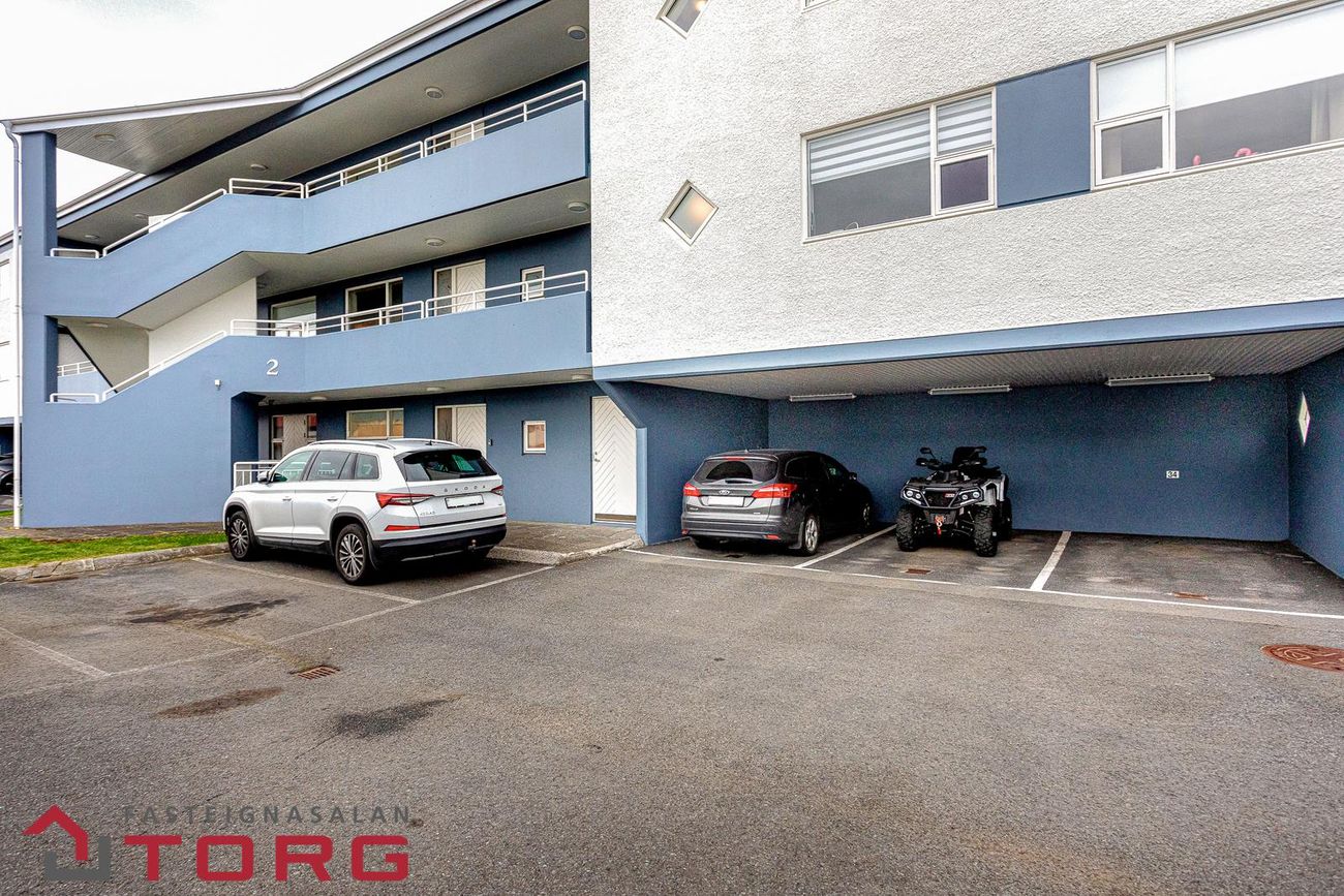 Bílastæði er sérmerkt í opinni bílageymslu