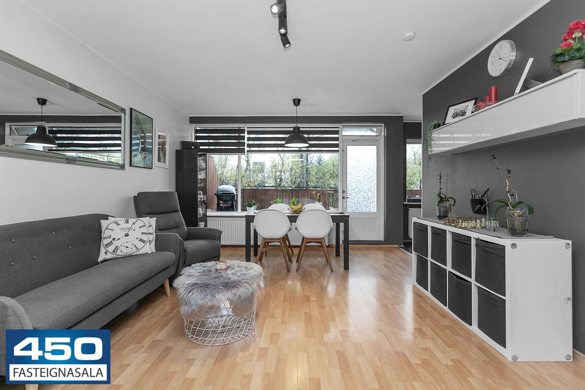 Garður: Framan við húsið er stór og snyrtilegur garður með skemmtilegum leikvelli fyrir börn ásamt fótbolta- / körfuboltavelli.