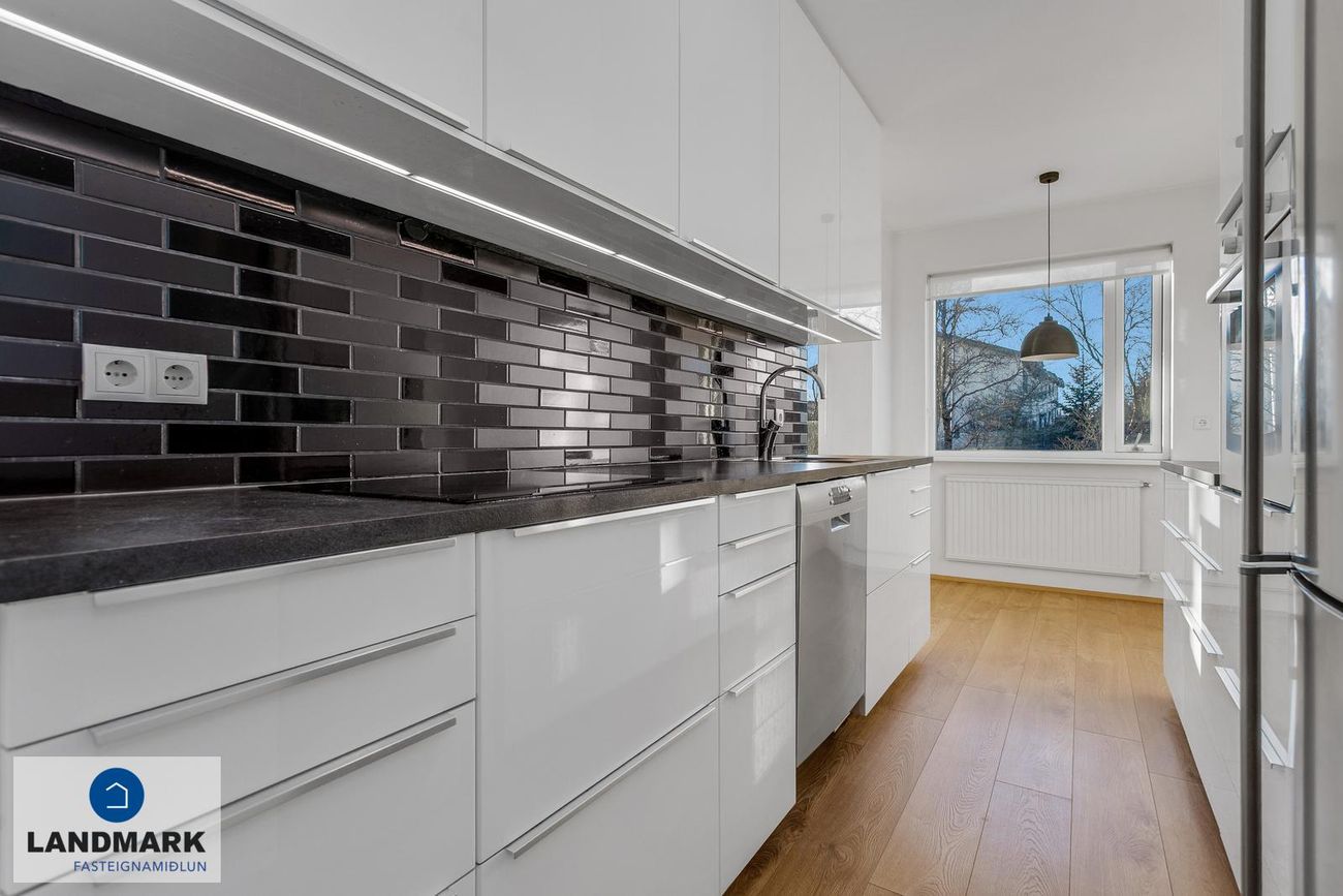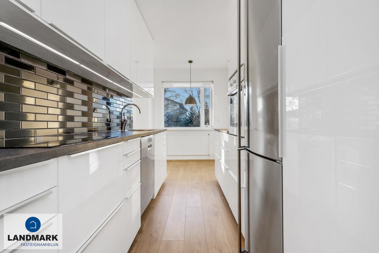Eldhús: Rúmgott eldhús með borðkrók, eldhúsið er opið í tvo enda. Innrétting með miklu skúffu- og skápaplássi, flísalagt milli innréttinga. Blástursofn, spanhelluborð, uppþvottavél og ísskápur.