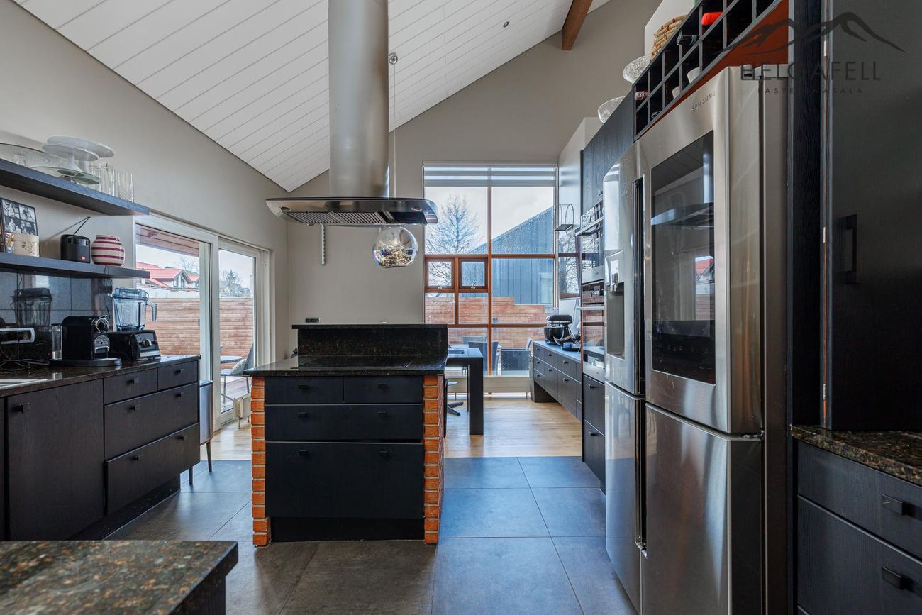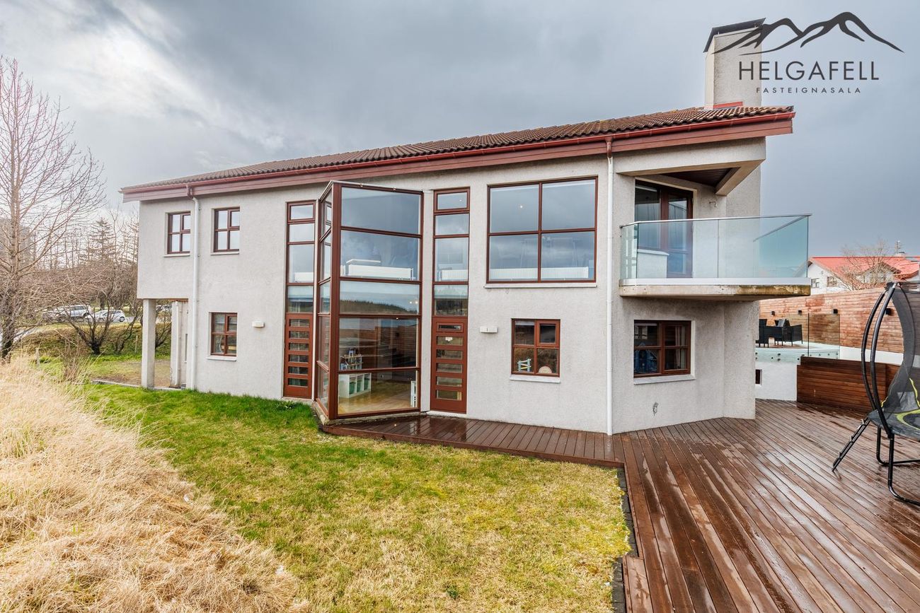 Þriggja pallaaðstaða: miðpallur með forstofu, eldhús og stóra verönd. Efri pallur með stofu, hjónaherbergi og baðherbergi. Neðri pallur með svefnherbergi, þvottahús og bílskúr. Möguleikar á aukaherbergjum.