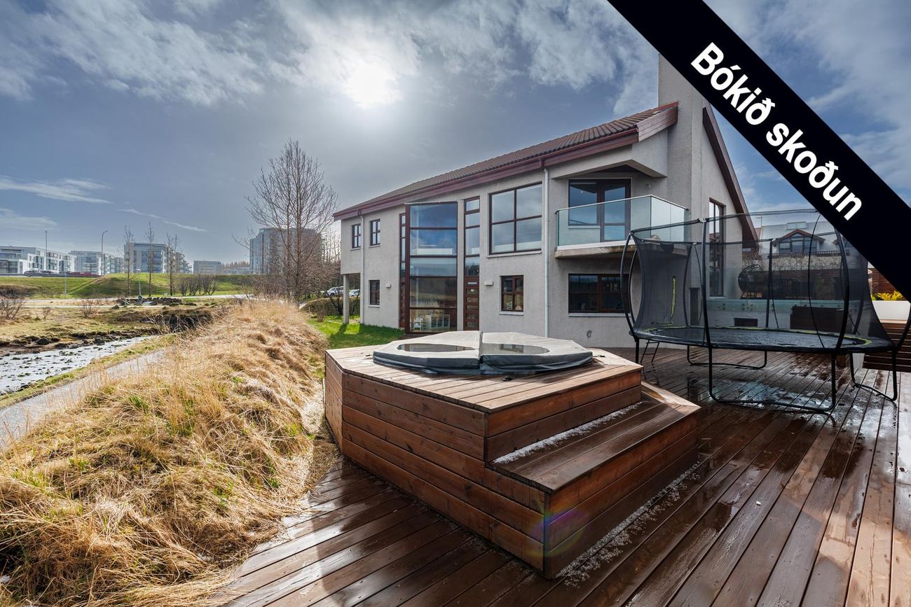 Stór harðviðarverönd til suðurs (um 200 fm) og hornsvalir til norðurs/vesturs með útsýni yfir sjóinn.