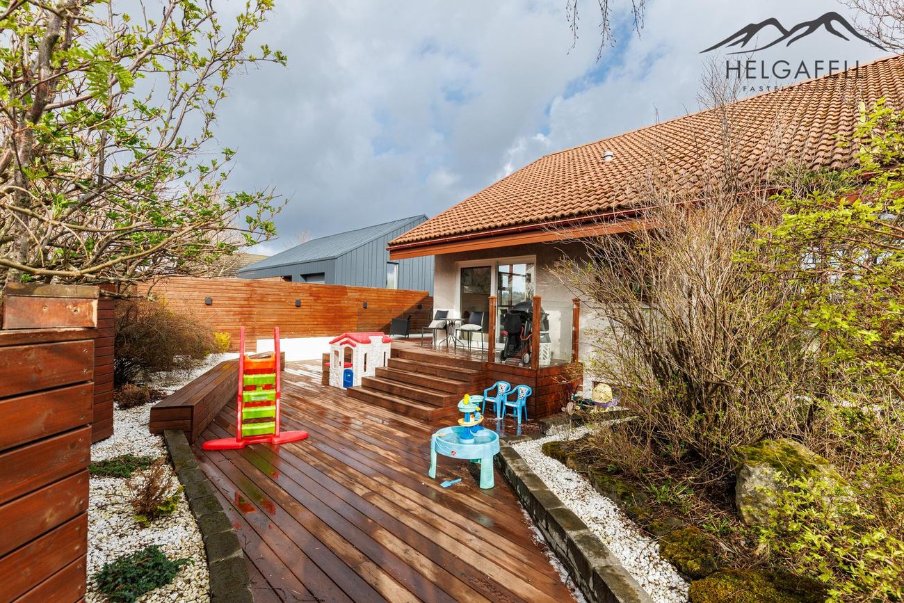 Fallegur aðgirtur garður með útieldhúsi, pizzuofni og upphækkuðum hitaveitupotti. Hellulögð bílastæði með hitalögnum.