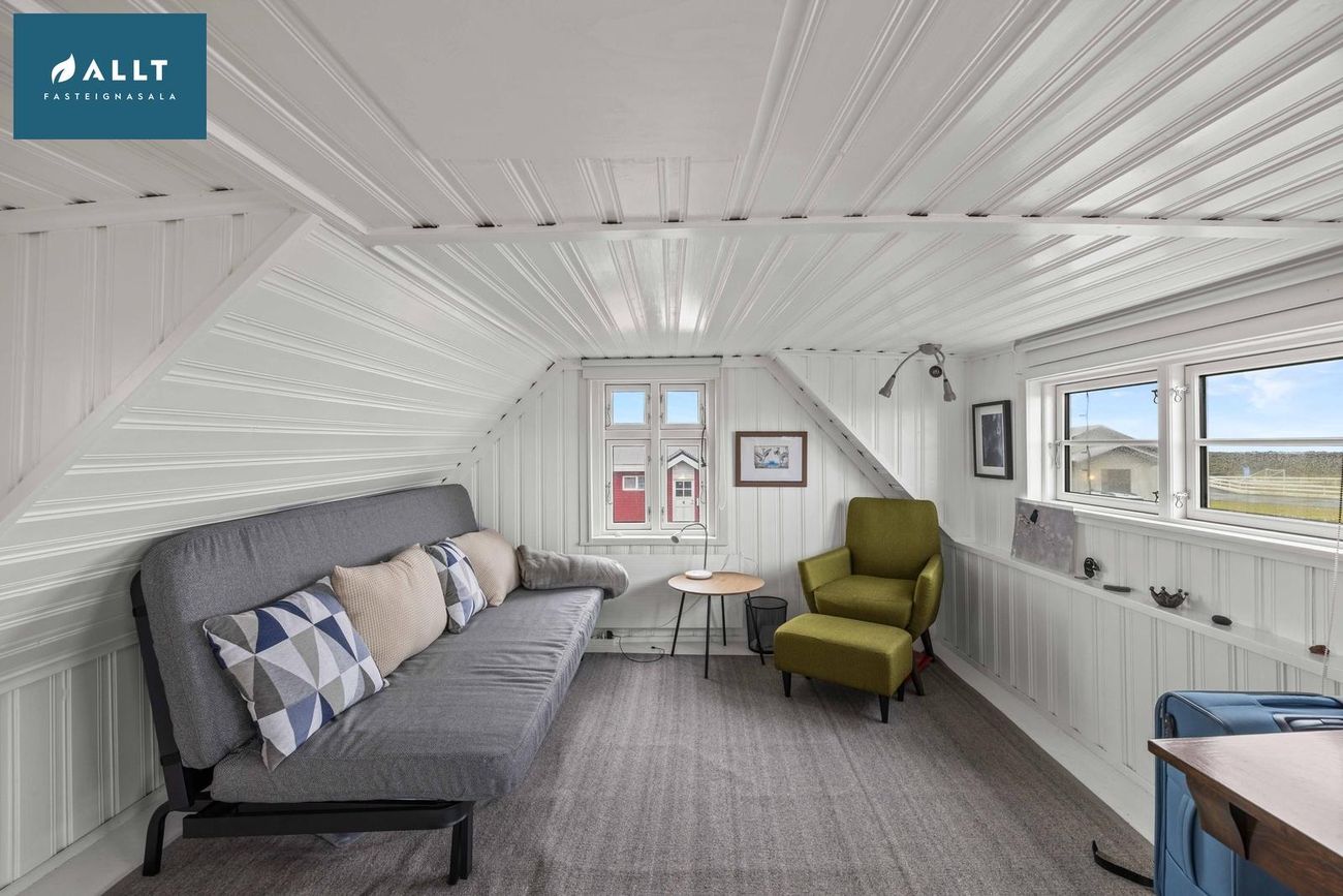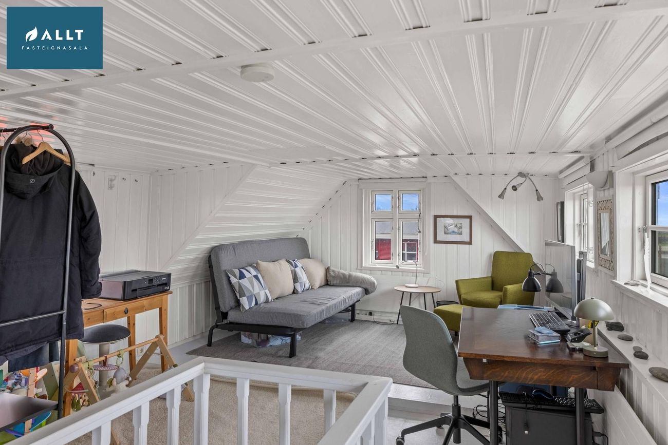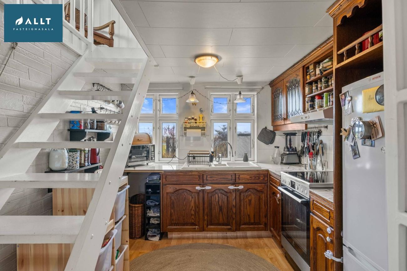 Frá eldhúsi liggur stigi upp í risið sem er eitt opið rými og hefur möguleika á að vera nýtt sem þriðja svefnrýmið eða stofa. Athugið að ekki er full lofthæð í risi.