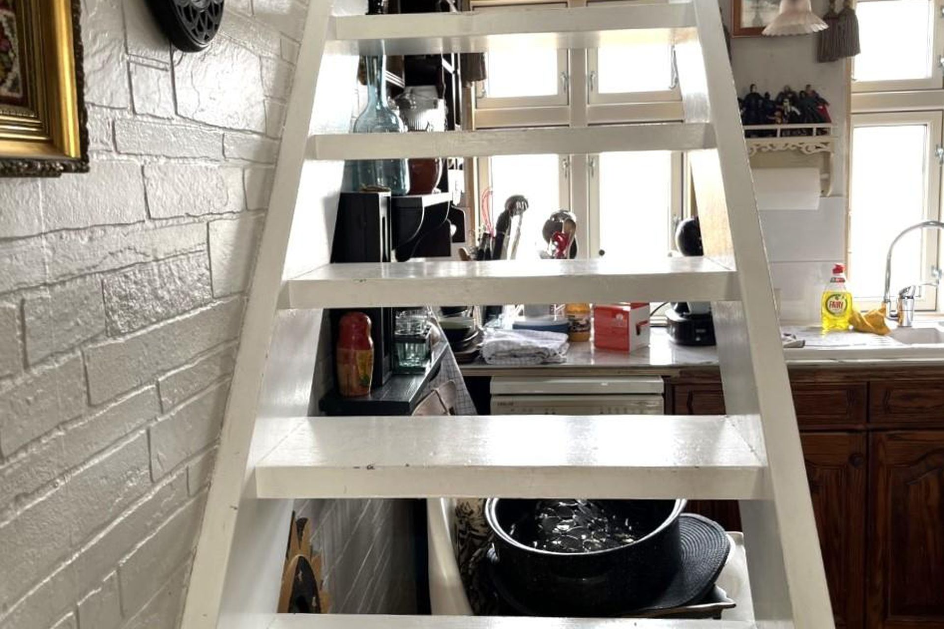 Lúga úr eldhúsi leiðir niður í kjallara sem nýtist sem geymsla.