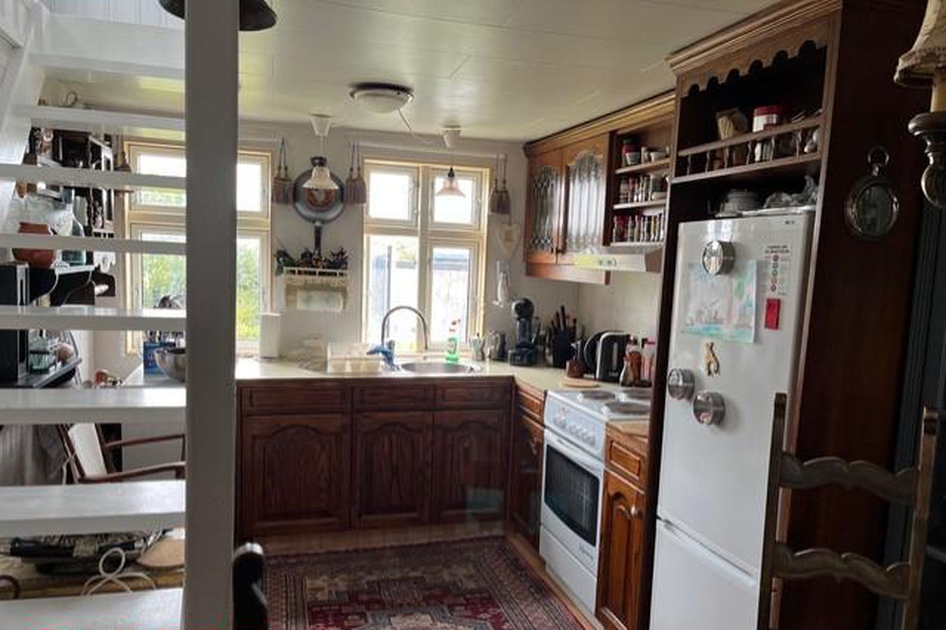 Eldhús með eldri innréttingu og góðu skápaplássi.