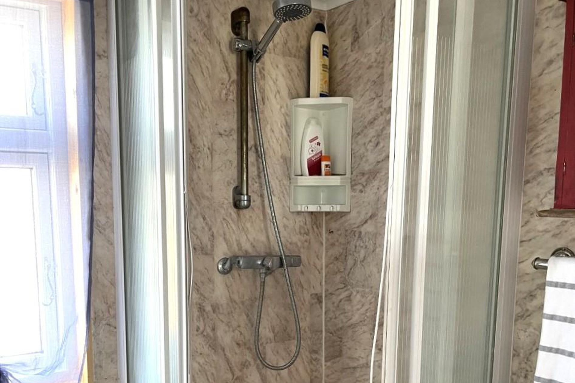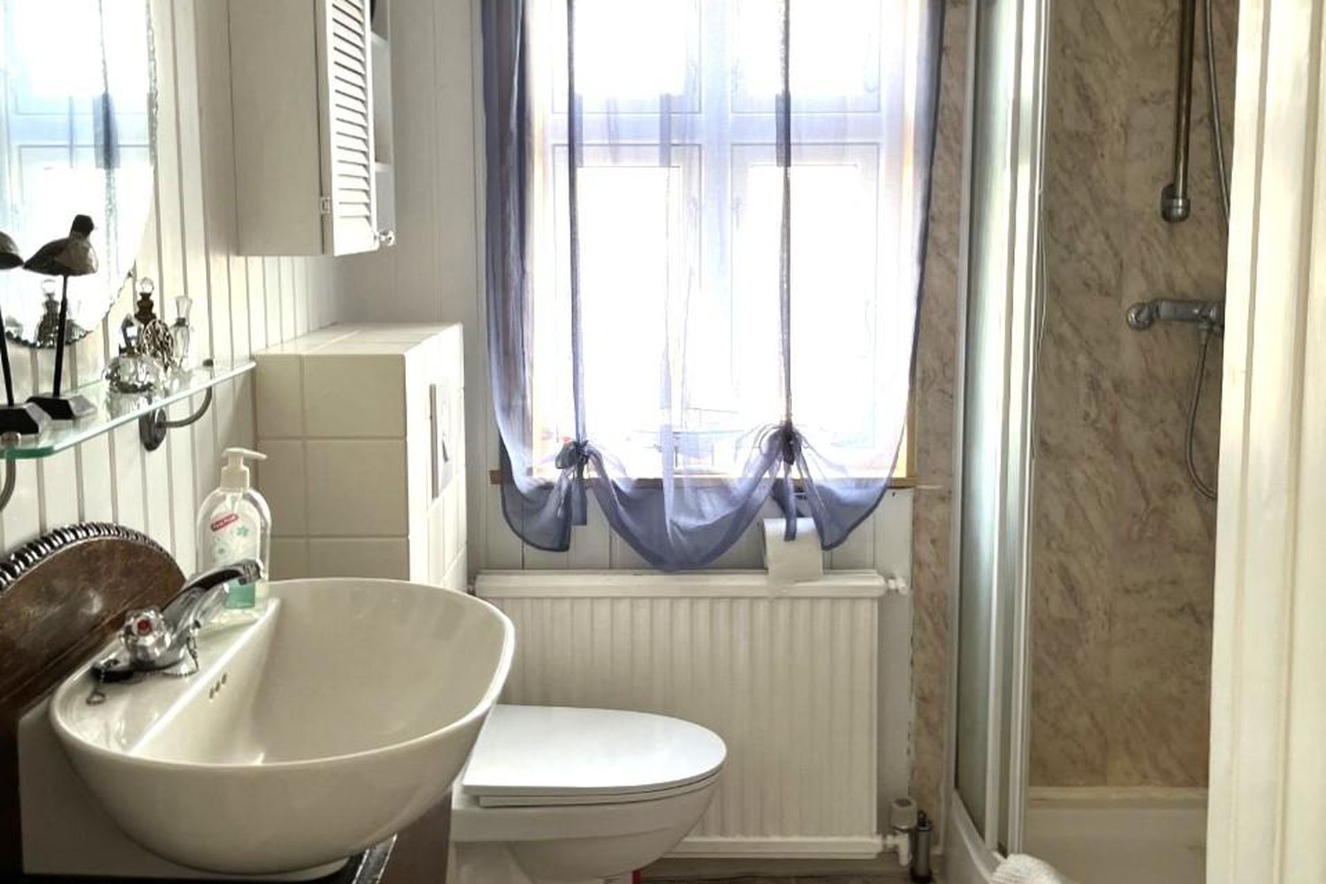 Baðherbergi með sturtu, upphengdu salerni, og vaskaskáp.