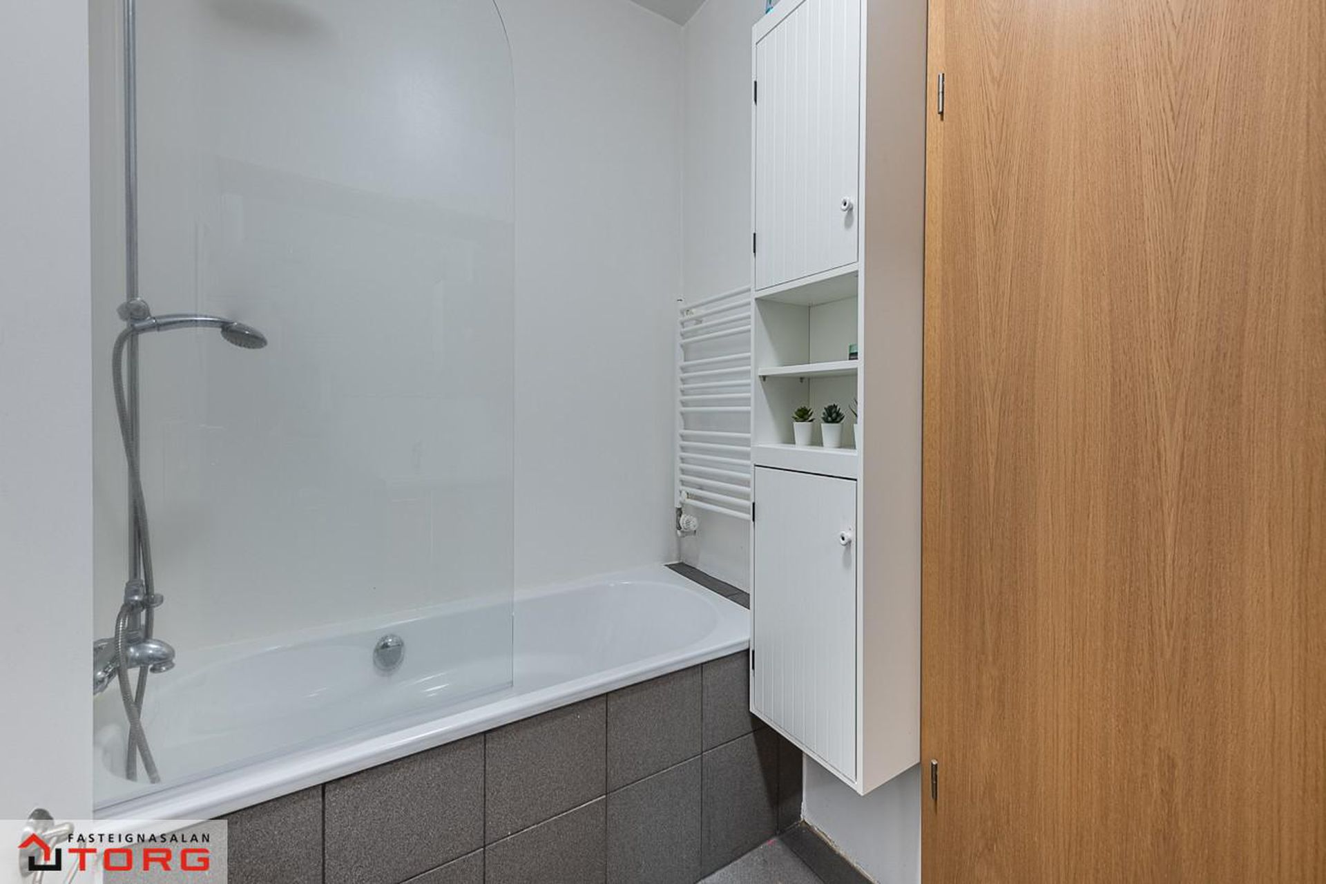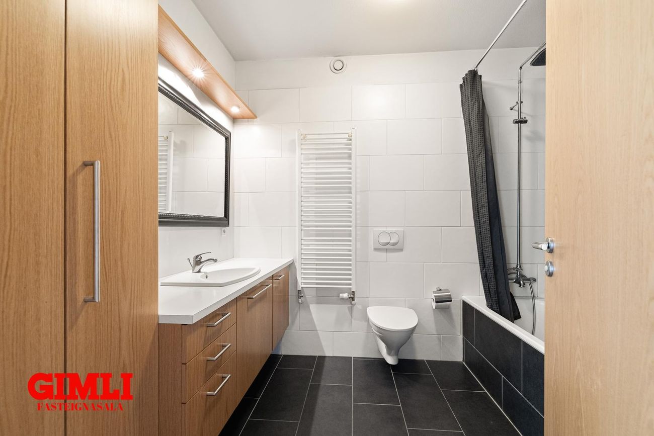 Baðherbergi: Flísar á gólfi og veggjum, baðkar með sturtuaðstöðu, eikarinnrétting með góðu skápaplássi.